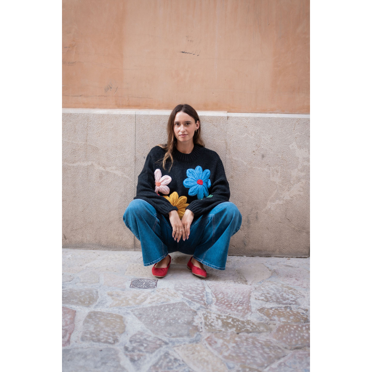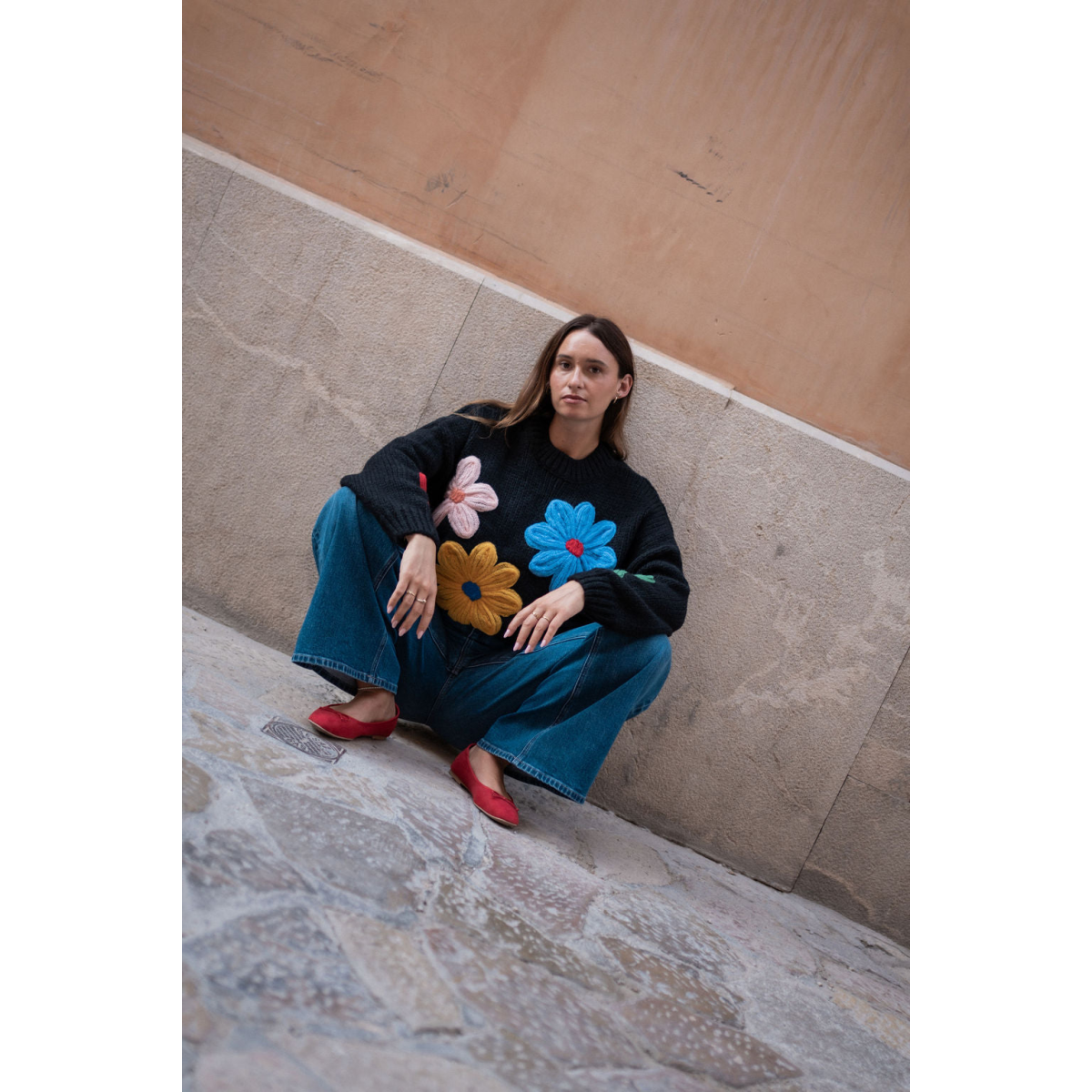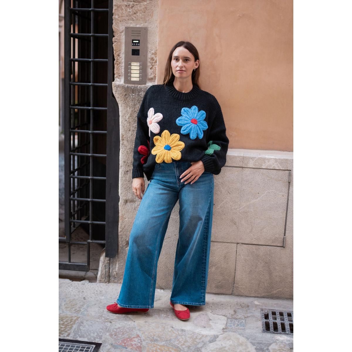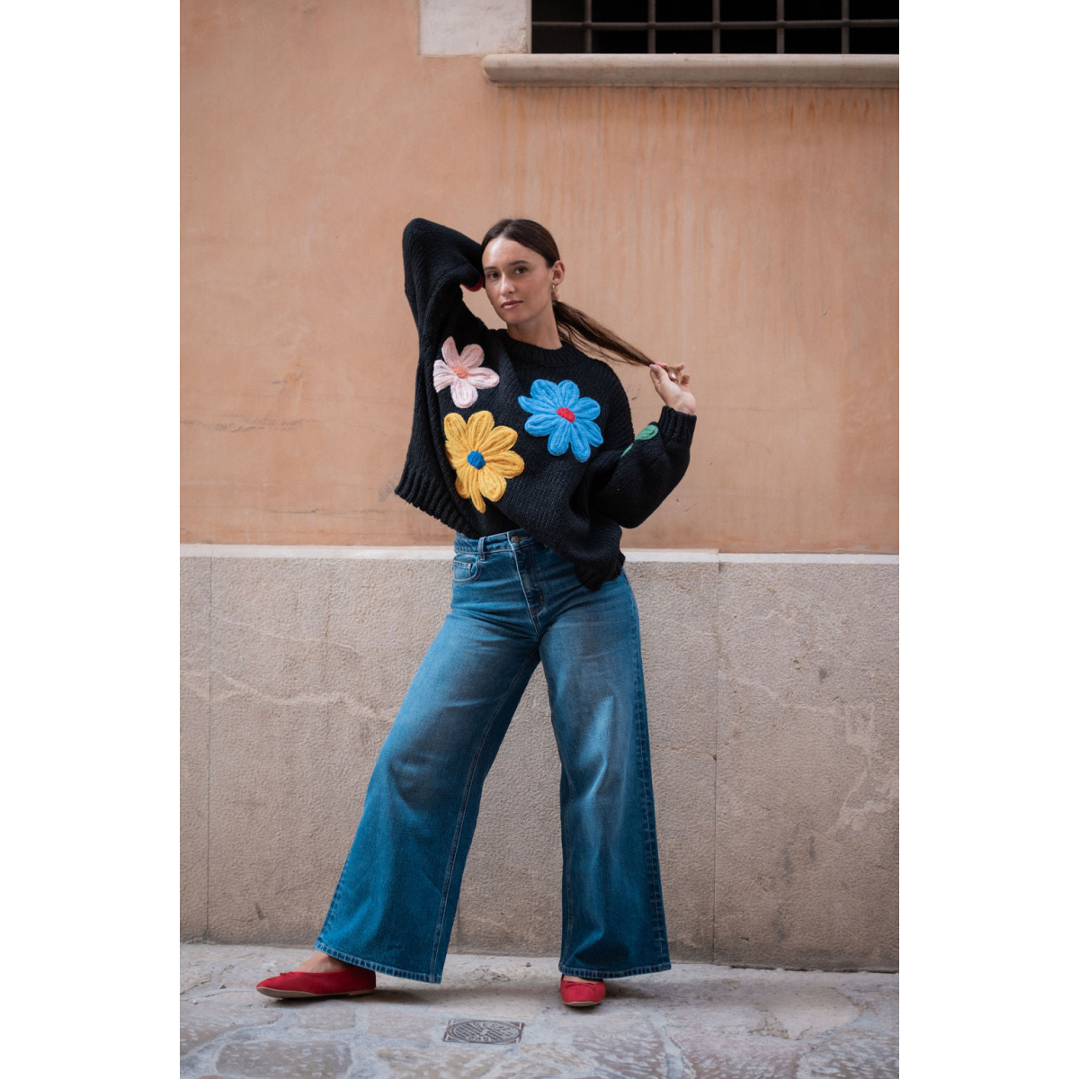 Black Floral Crochet Chunky Knit Oversized Jumper
