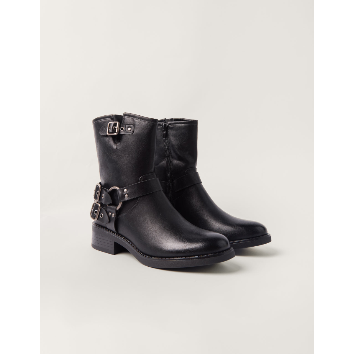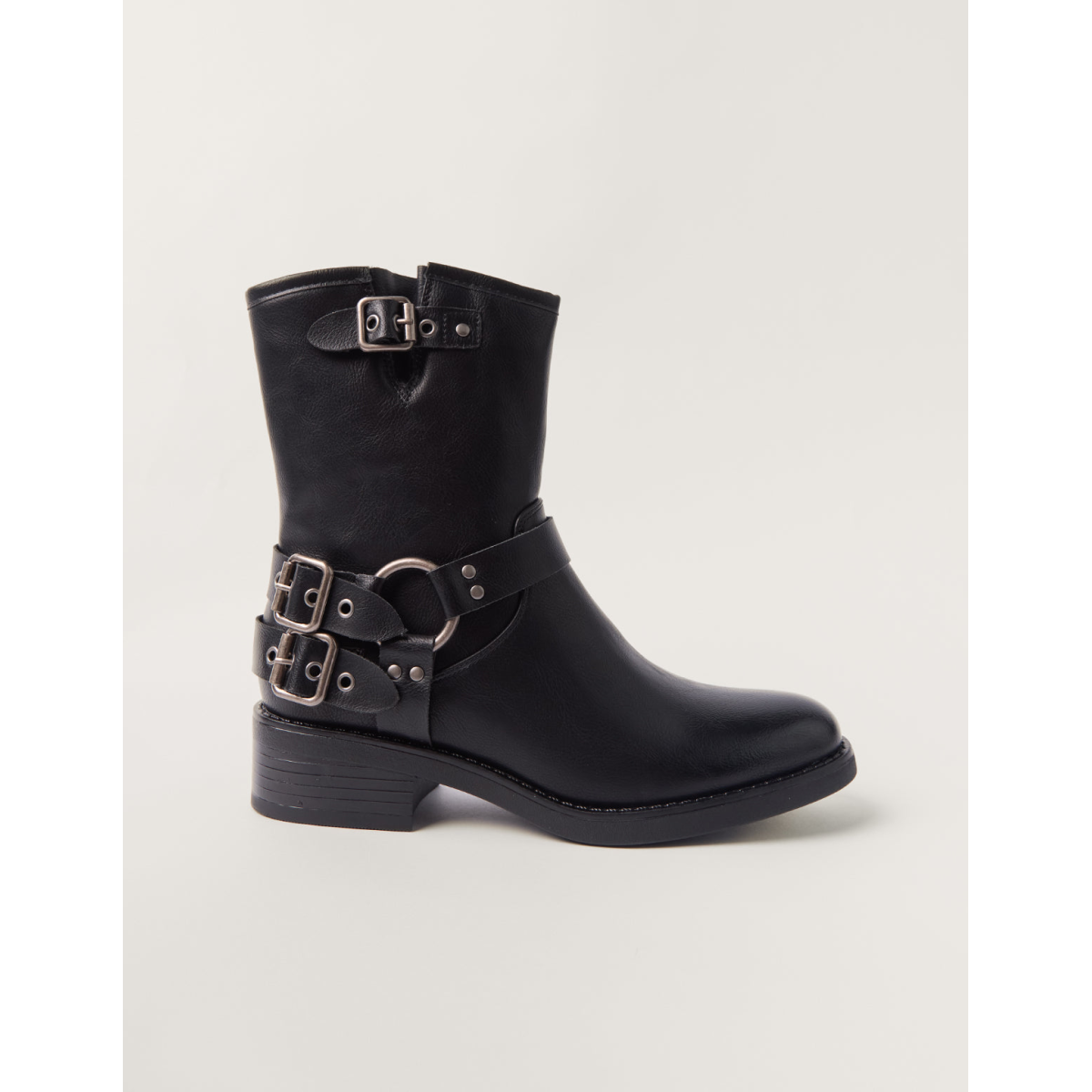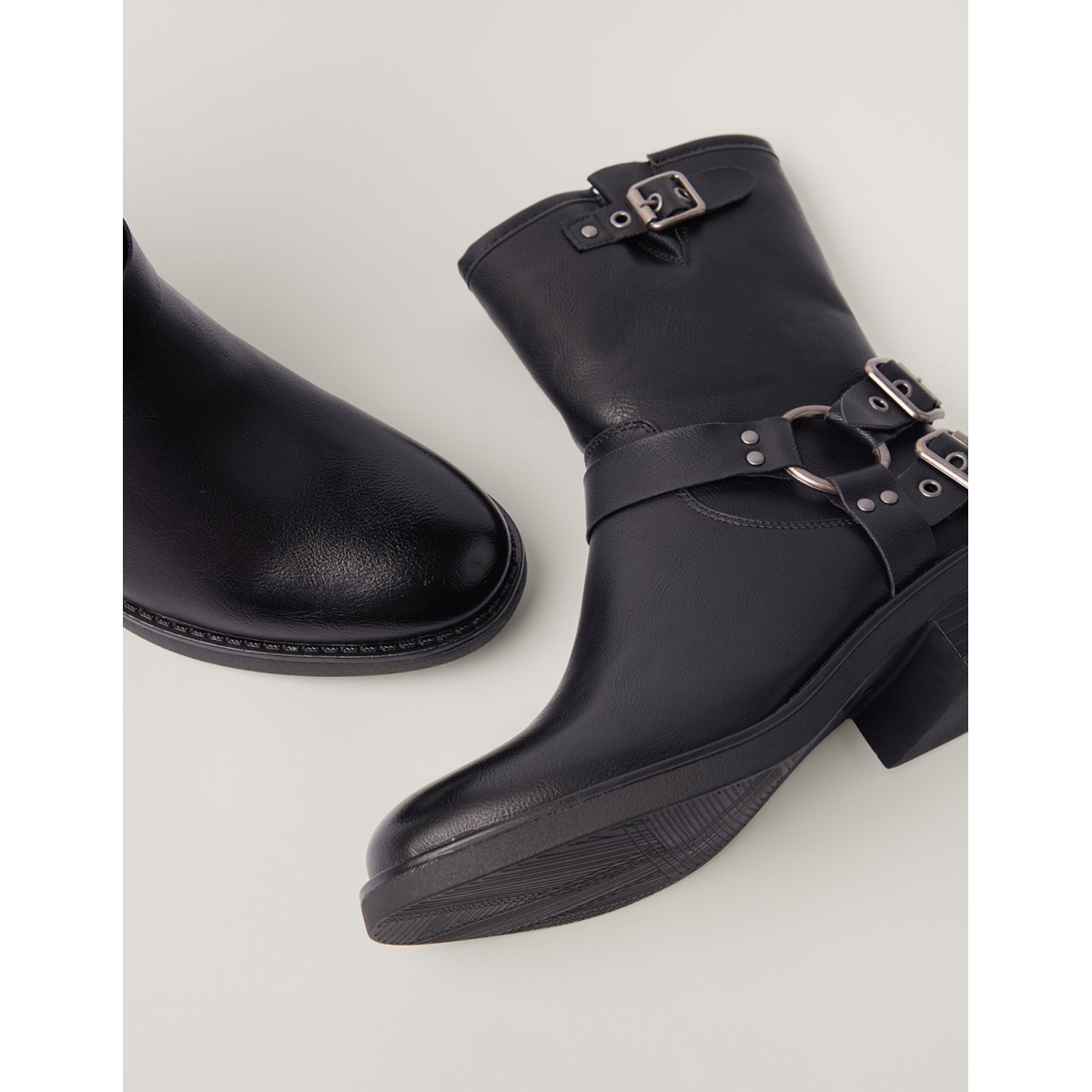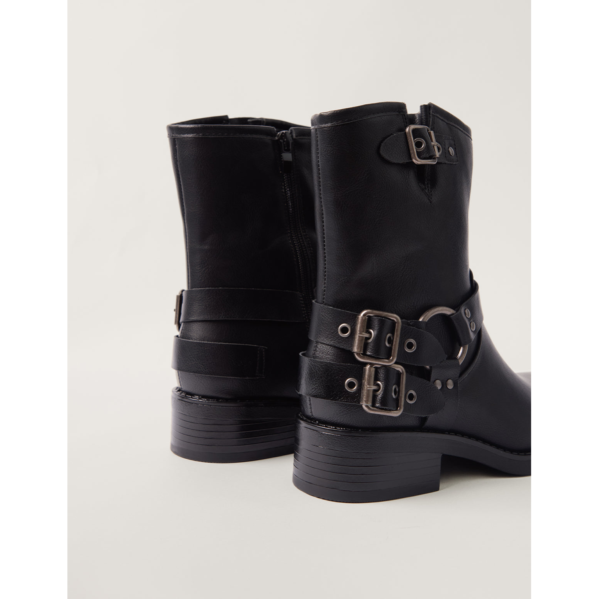 A chunky style for the cooler weather ahead, these leather-look biker boots with multiple buckles are comfy and hard wearing.