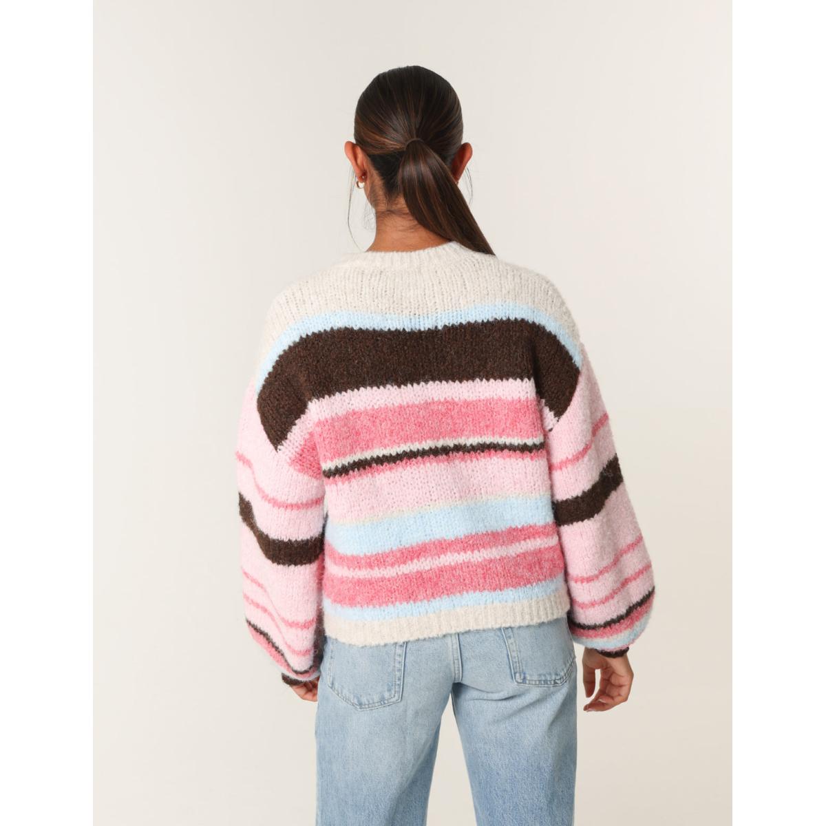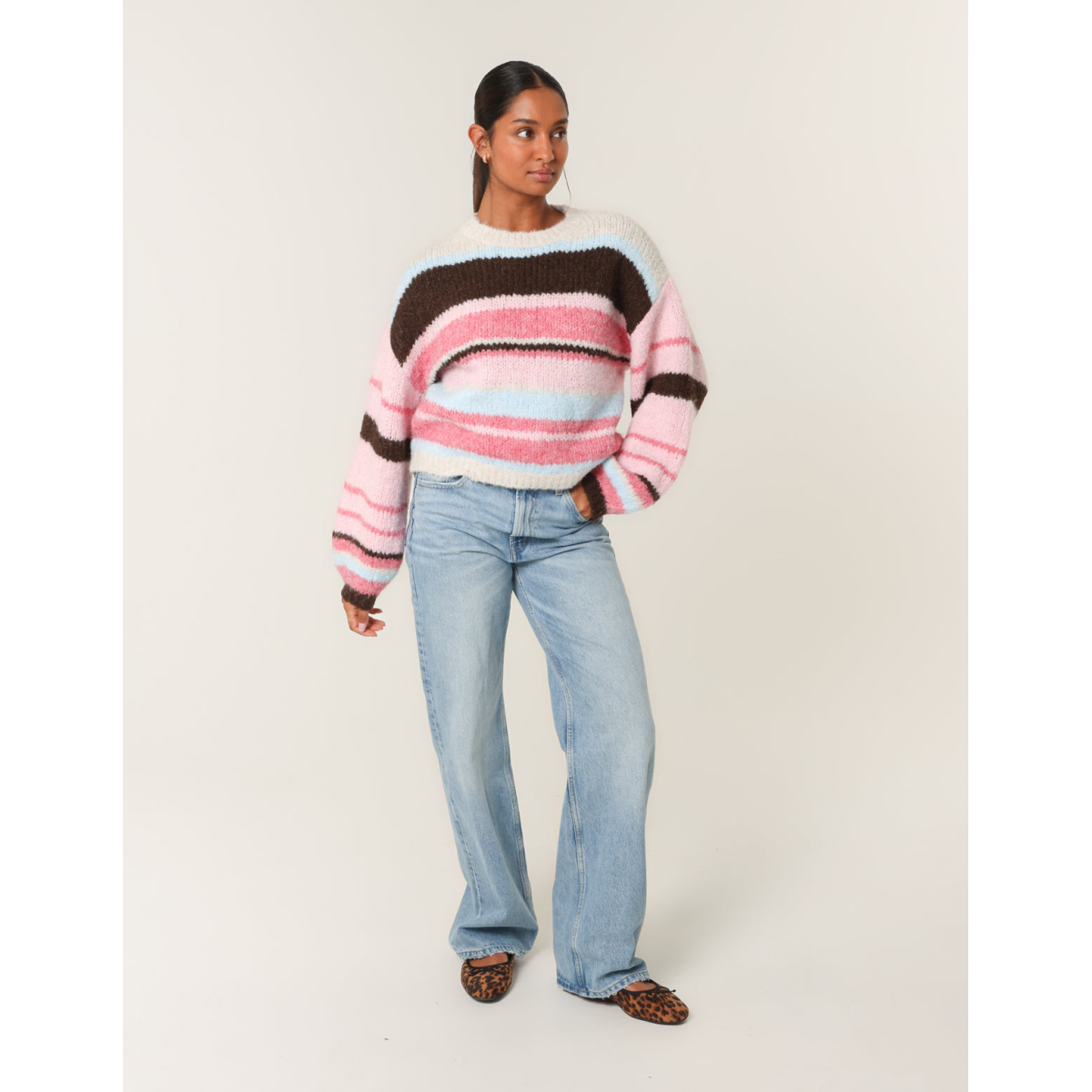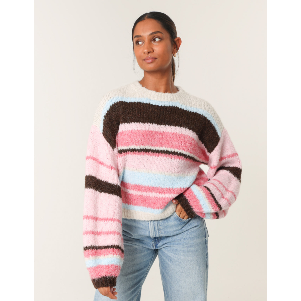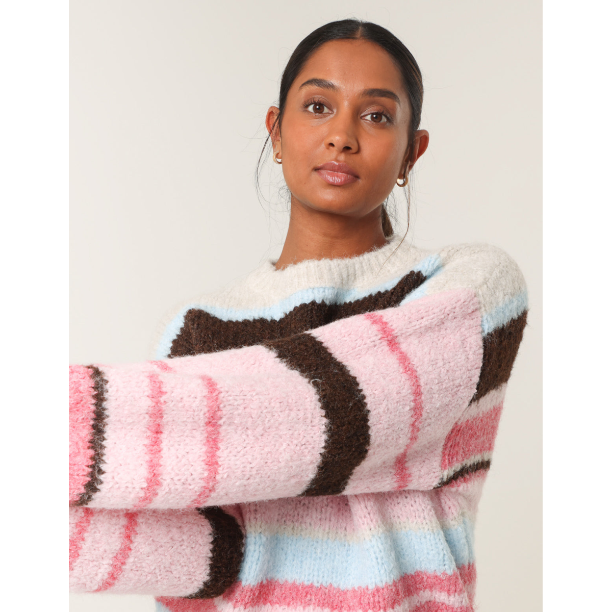 And a retro feel to our everyday look. Team this block colour striped jumper with flared jeans and chunky boots. Add a PU jacket and a swipe of red lipstick to finish off this trendy look.