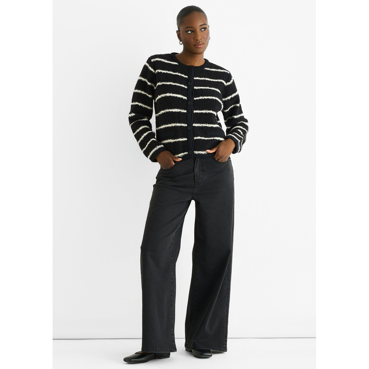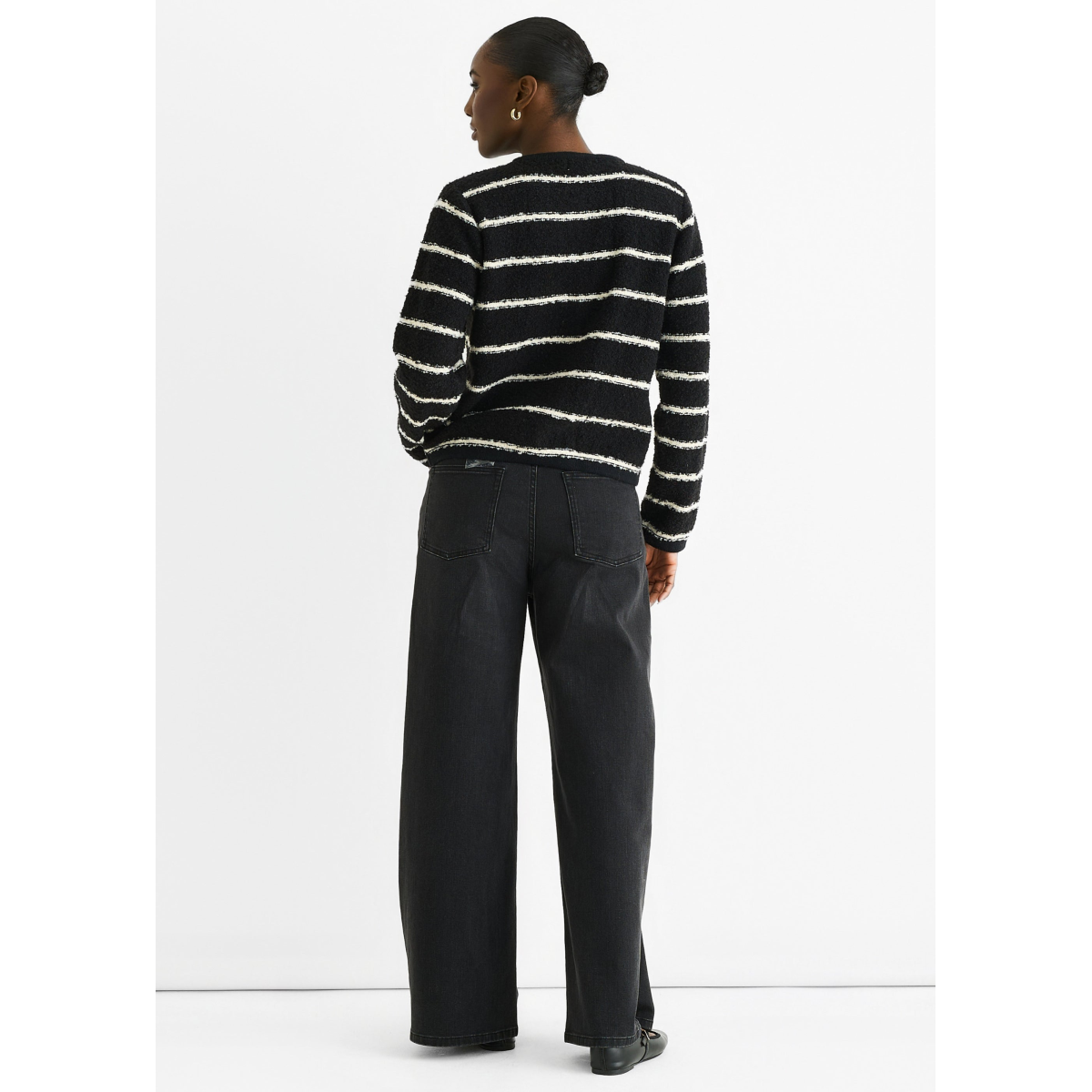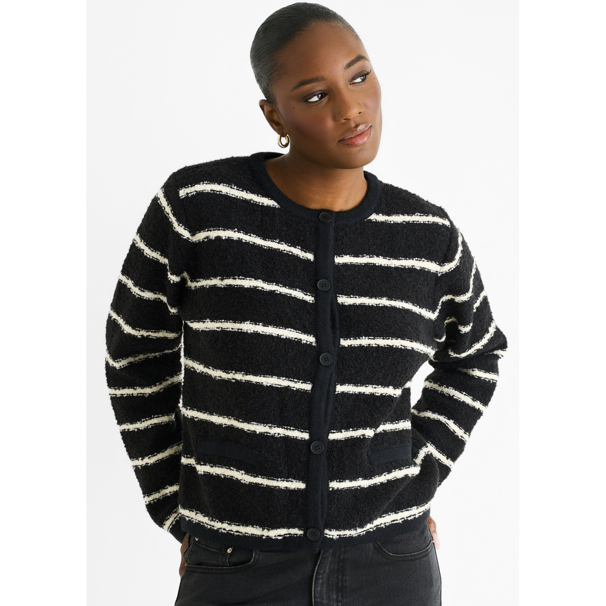 The Black Stripe Boucle Recycle Knit Cardigan combines bold style with everyday comfort. Crafted from recycled knit fabric, it features striking black stripes and a cropped fit that adds a modern, military-inspired touch. Perfect for casual layering, this cardigan offers a comfortable, eco-friendly option to elevate your wardrobe.
