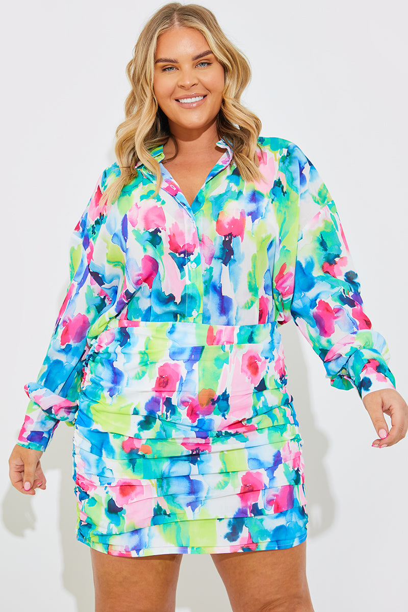 Get ready for the new season with our new multi printed ruched mini skirt. Wear with the matching shirt for a look we're loving.