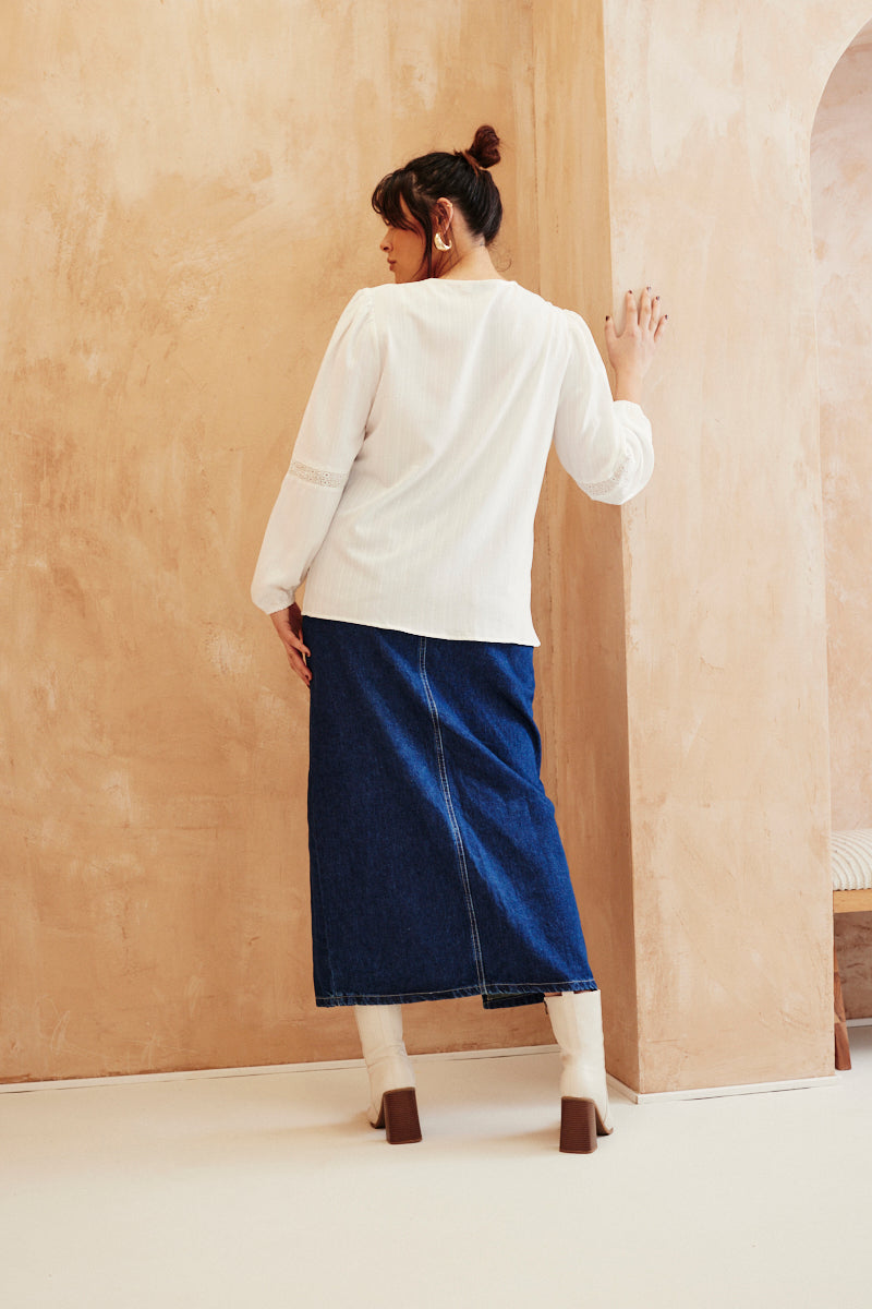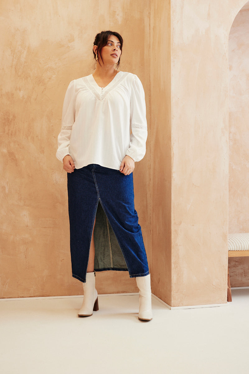 Stay on trend with our new white v neck blouse from our new boho drop, featuring crochet insert, this will elevate your look. Pair with jeans or a skirt for chic vibes. Â