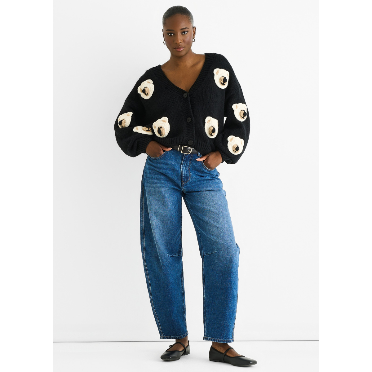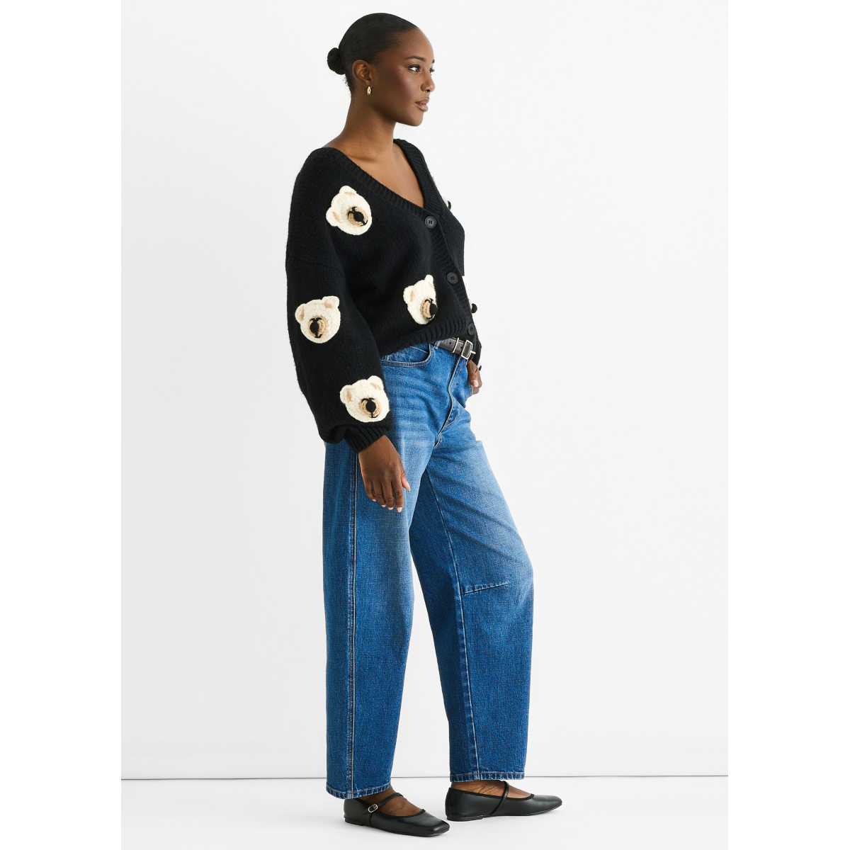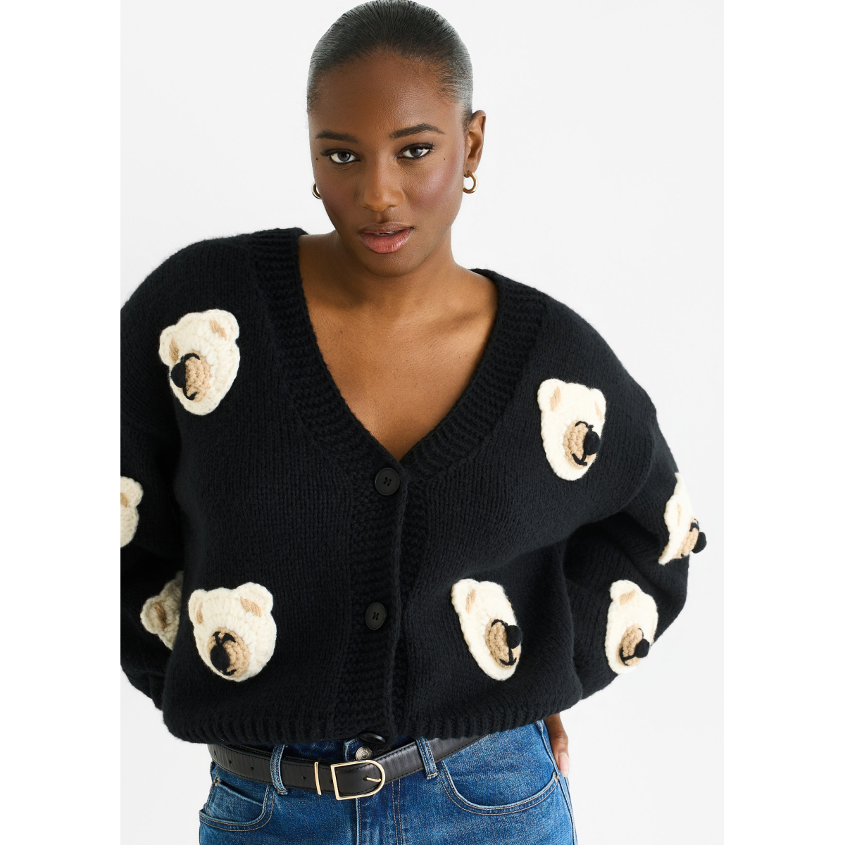 Stay warm and stylish with the Black 3D Contrast Teddy Crochet Cardigan. Its soft teddy texture combined with bold 3D crochet detailing creates a comfortable yet eye-catching piece, perfect for adding a casual, confident touch to your everyday outfits.