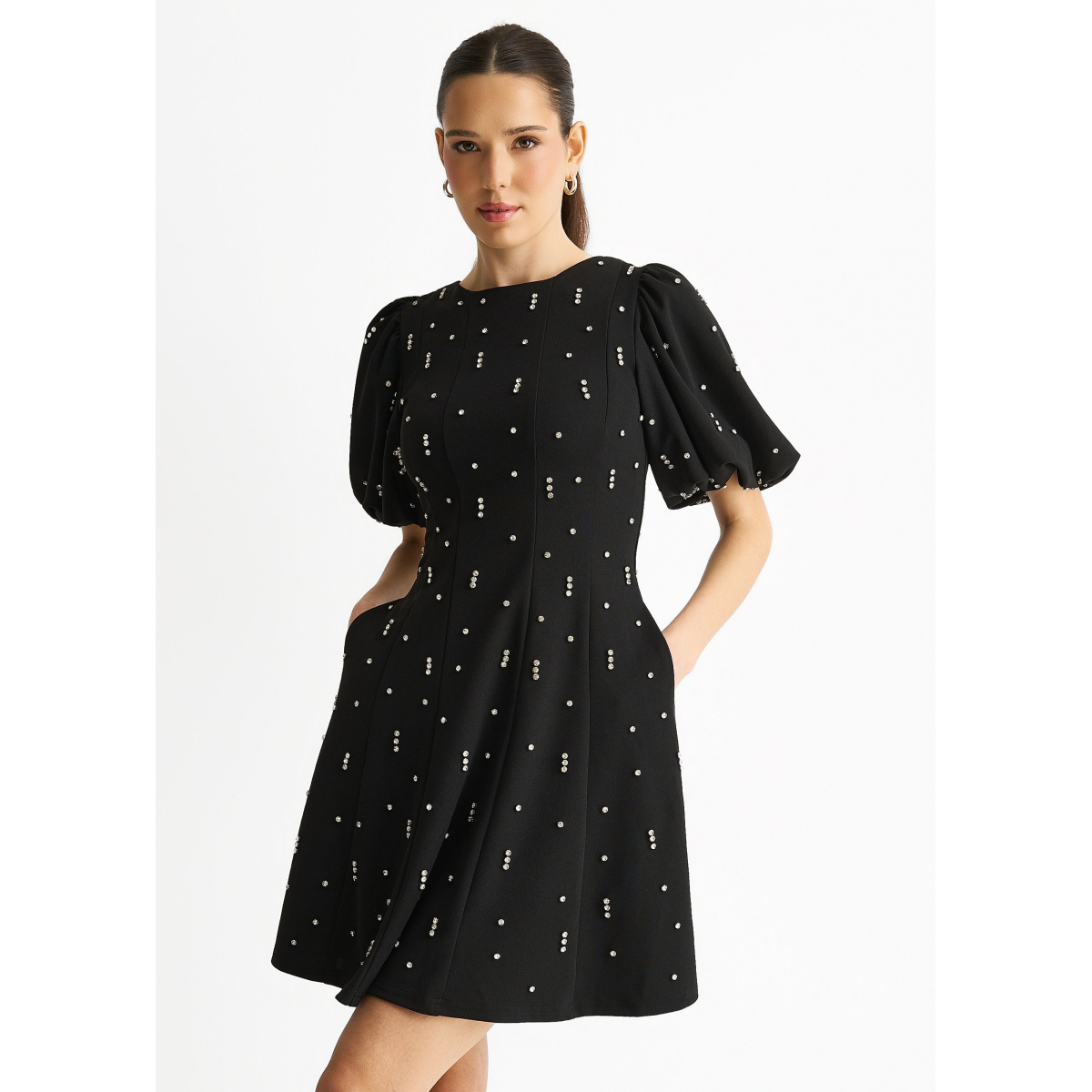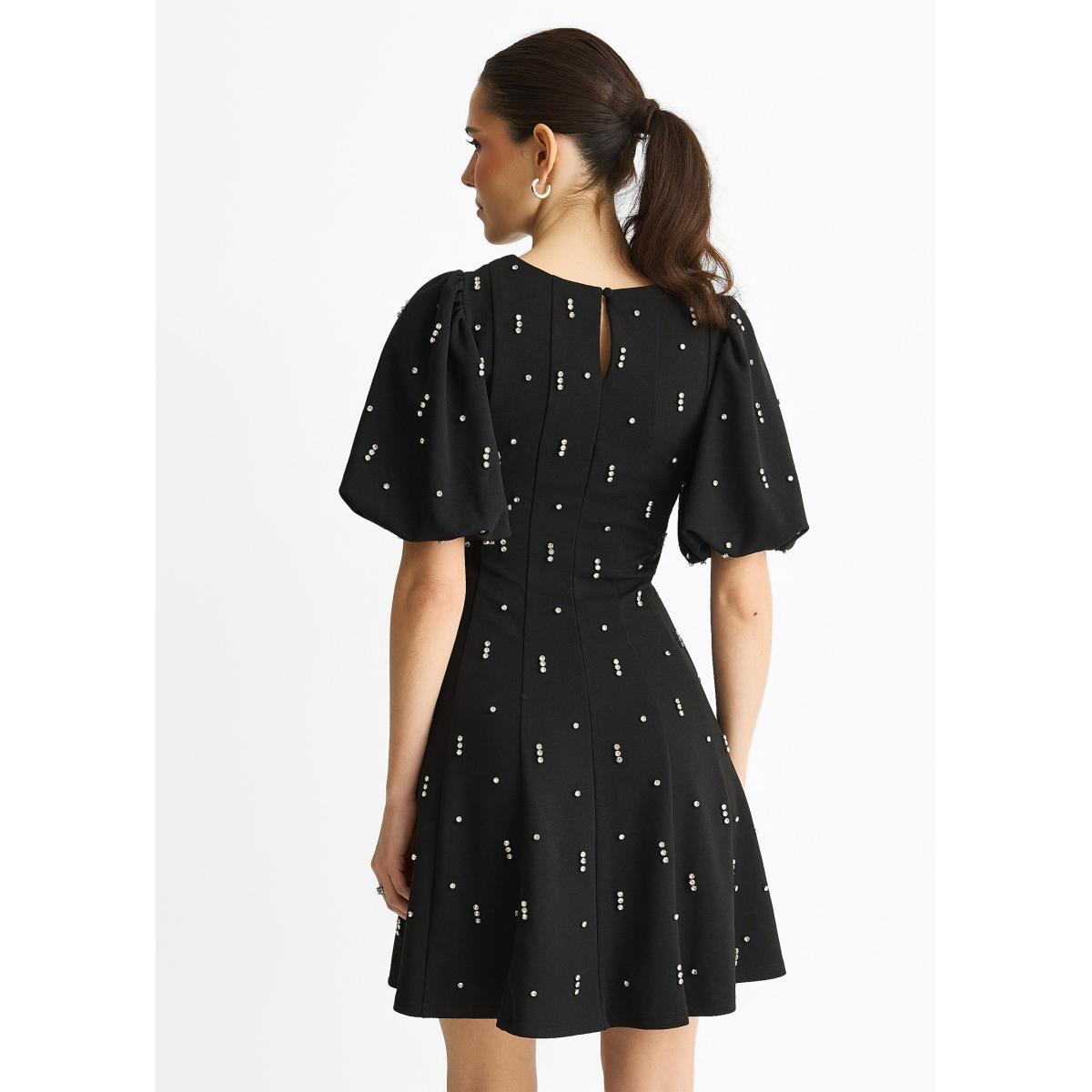 Black Diamante Trim Puff Ball Sleeves Stretchy Mini Dress