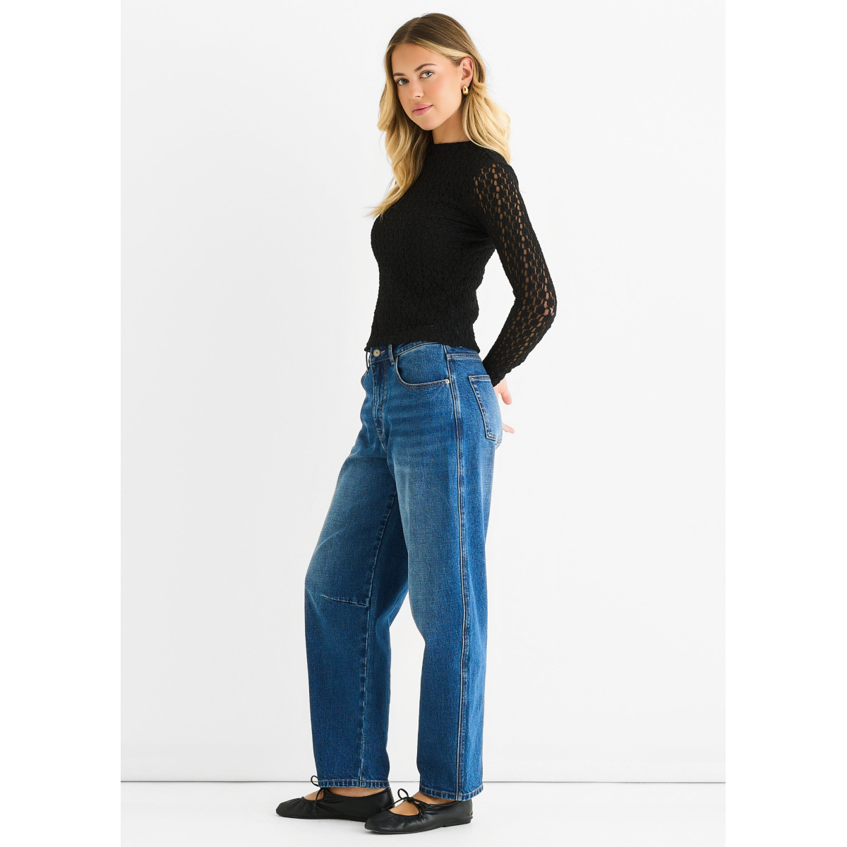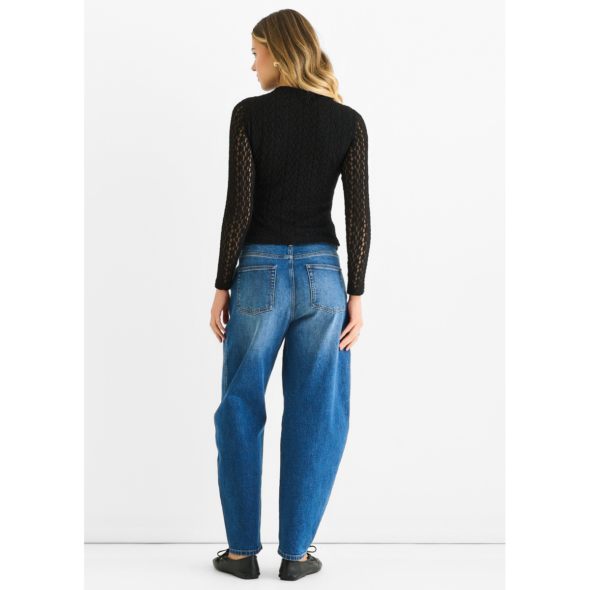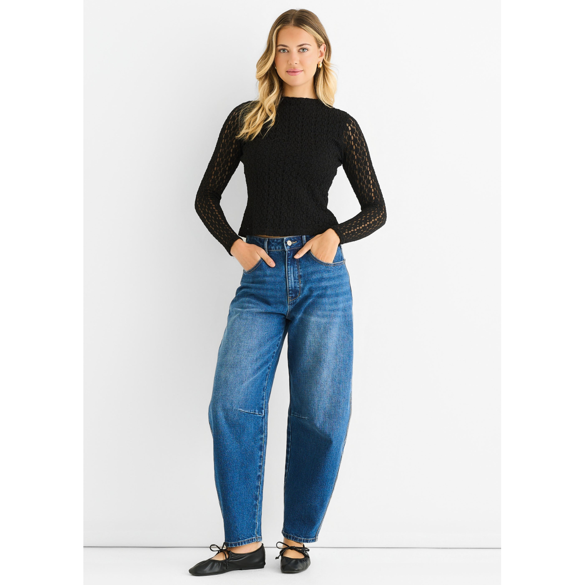 This black top offers a bold yet comfortable look with its soft jersey fabric and high neckline. The long lace sleeves add a stylish, feminine touch while keeping the vibe casual and easy to wear all day. Perfect for confident, everyday style.