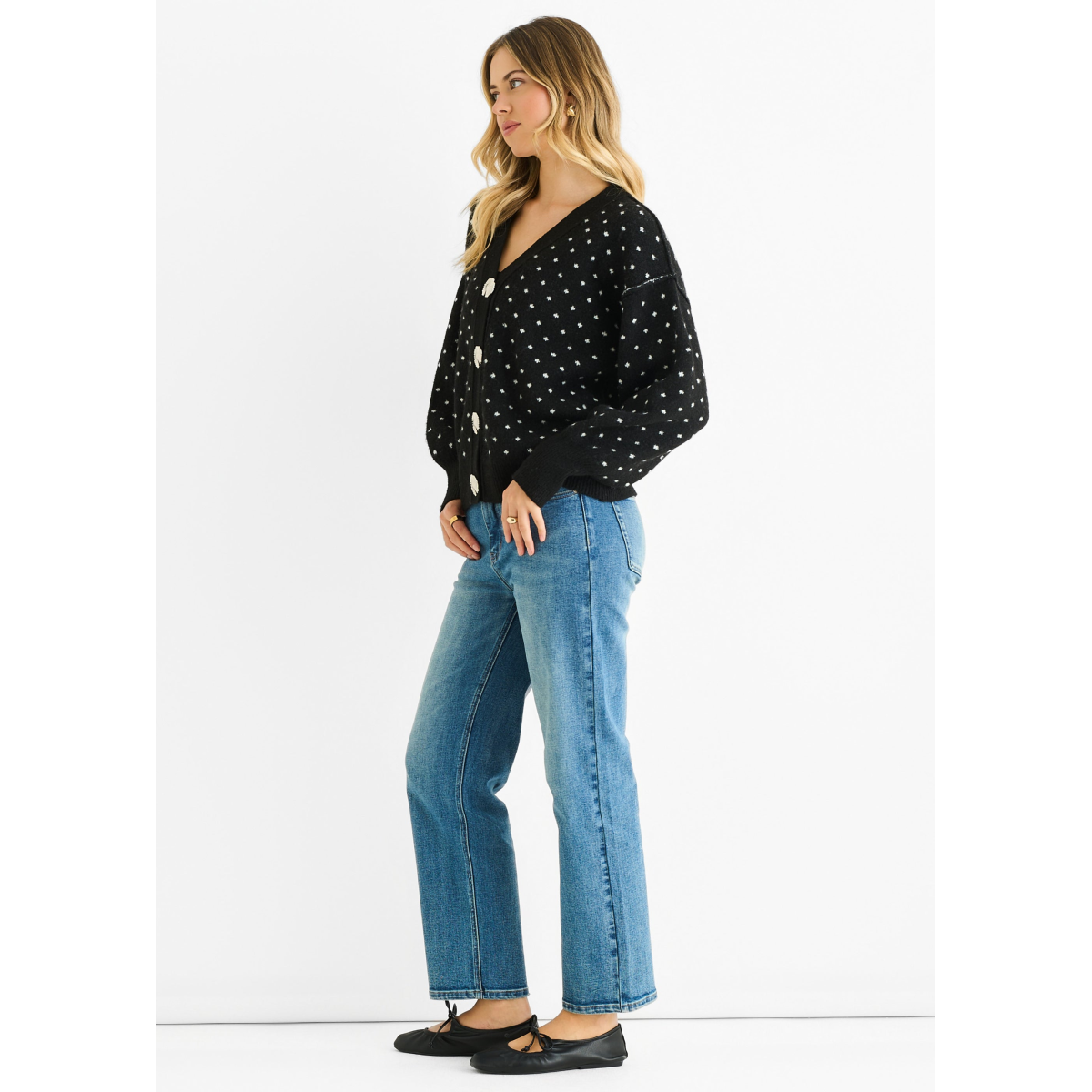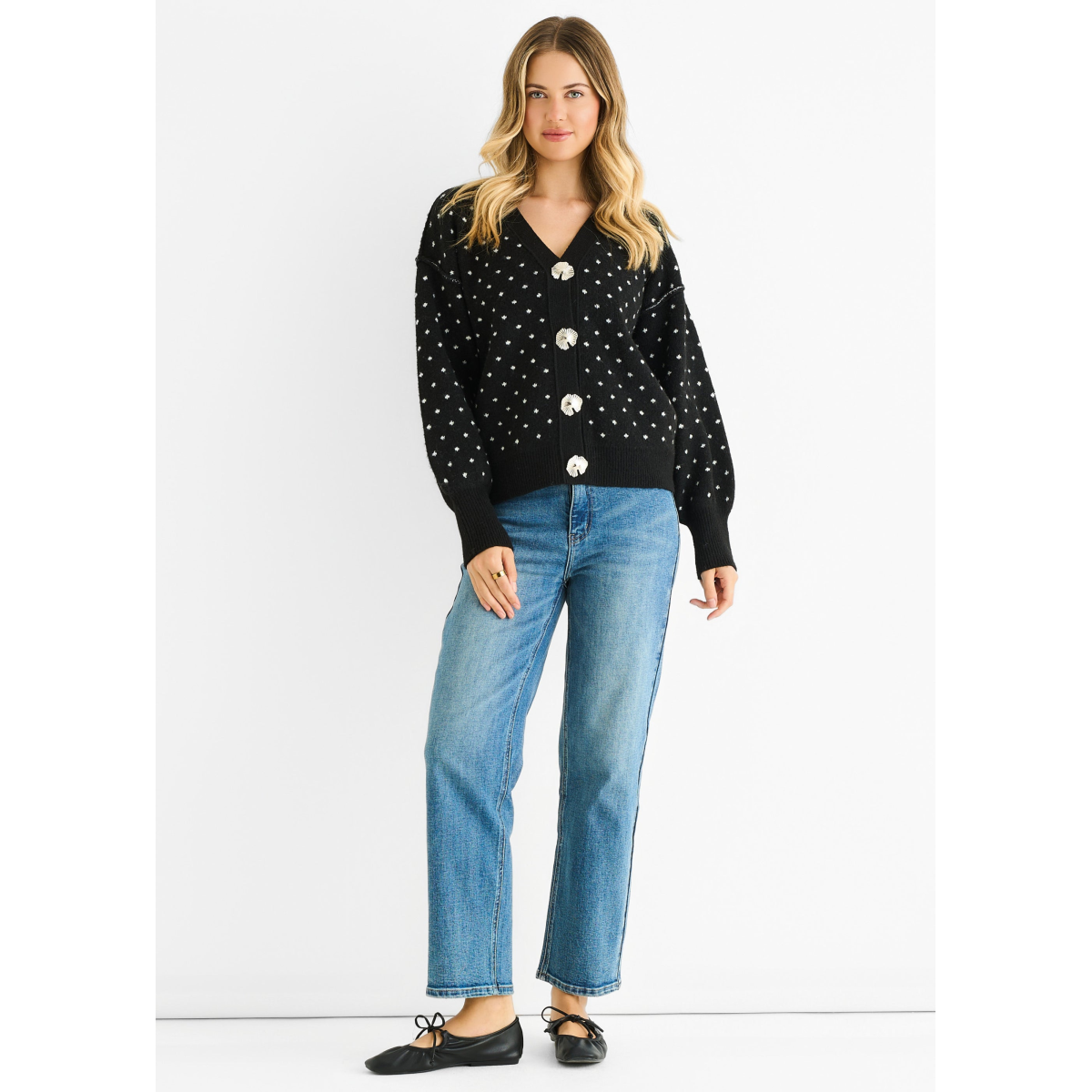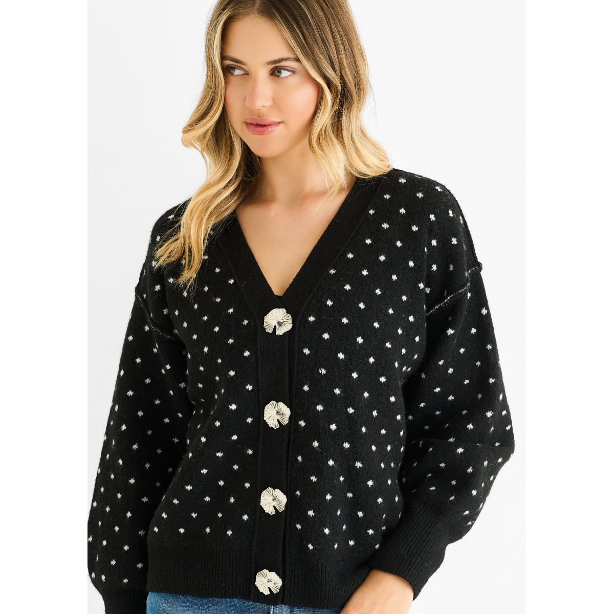 This Black Spot Print Button Cardigan Look Jumper offers a comfortable fit with a striking spotted pattern that stands out. Designed for casual wear, its button-front style adds versatility, making it easy to layer or wear alone. Perfect for those who want to combine boldness with everyday comfort.
