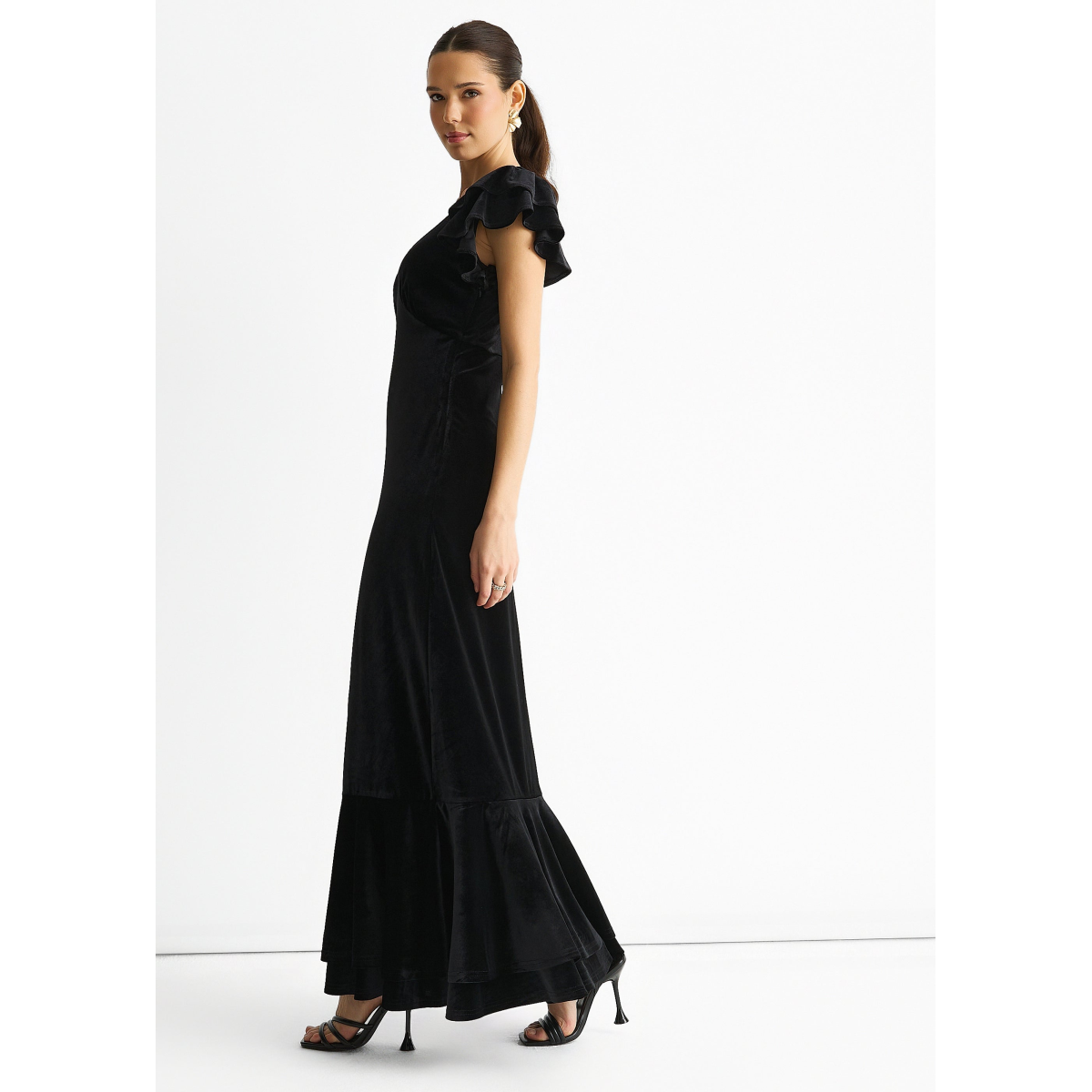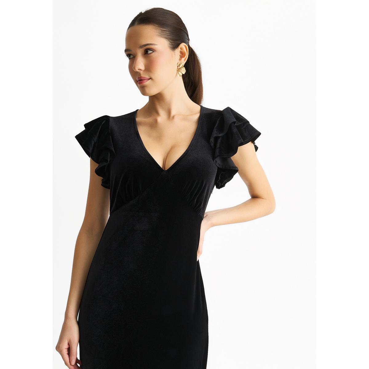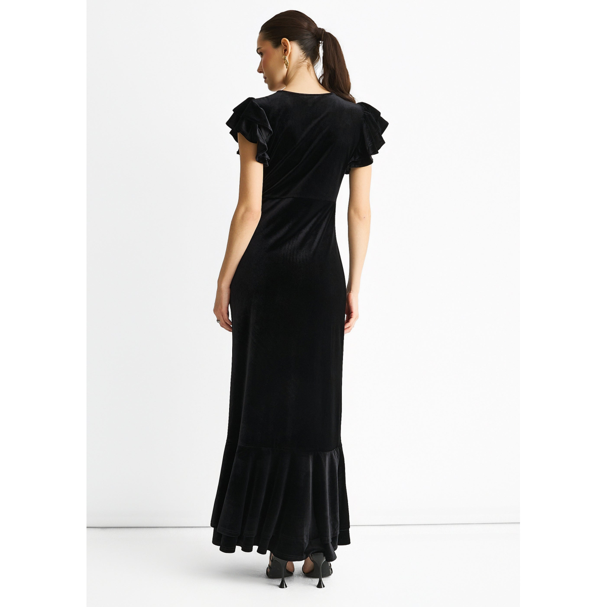 Black V Neck Ruffle Sleeves Velvet Occasion Maxi Dress