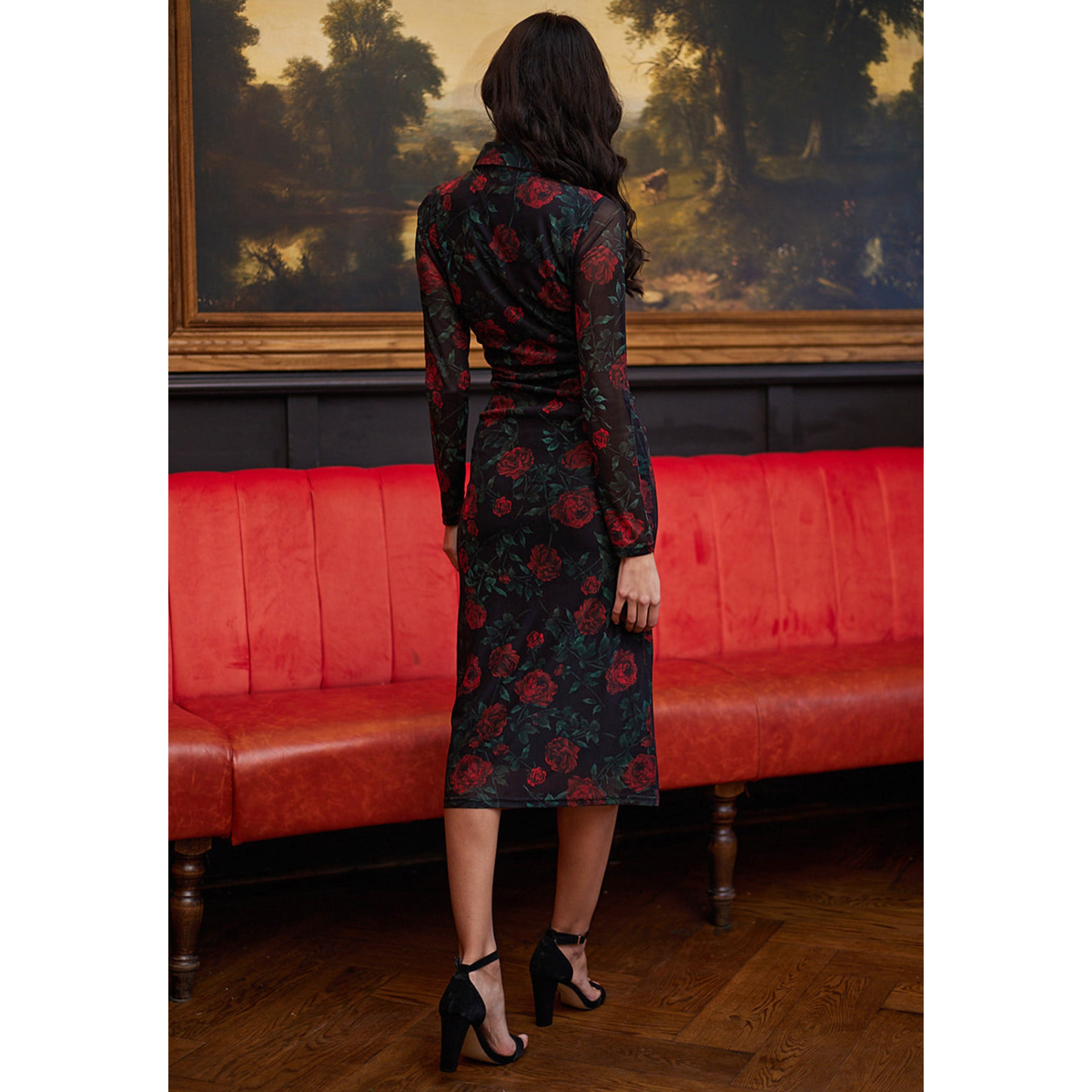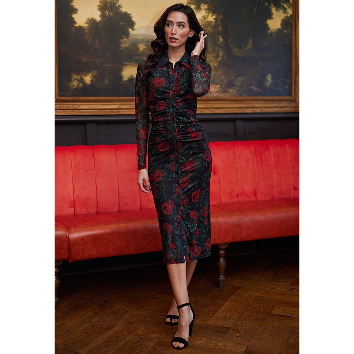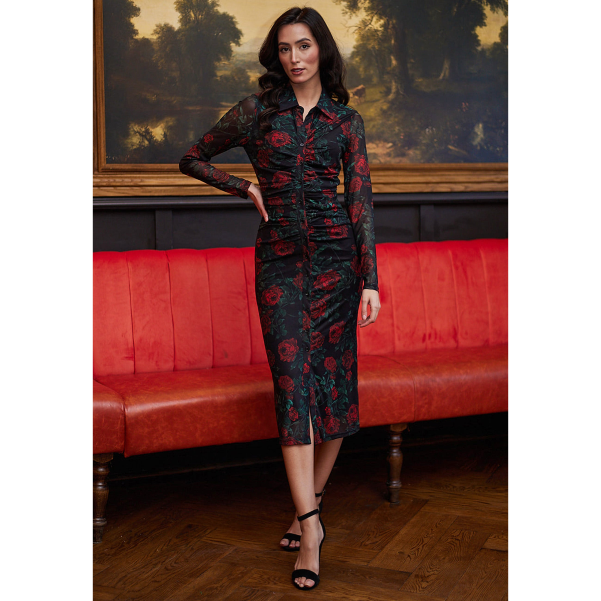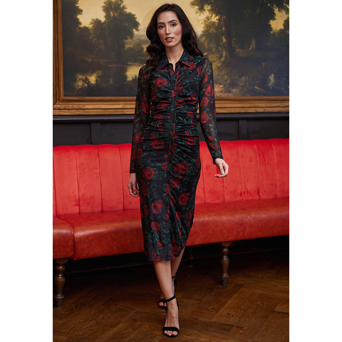 Rock autumnal florals in the Bodycon Mesh Shirt Dress in Black Rose Print by ANGELEYE. This long sleeve, mesh dress with ruching detail is designed to flatter. Transition in style with this gorgeous print in the season's coolest colour, red. Pair with heels for evening plans or dress down for work.
