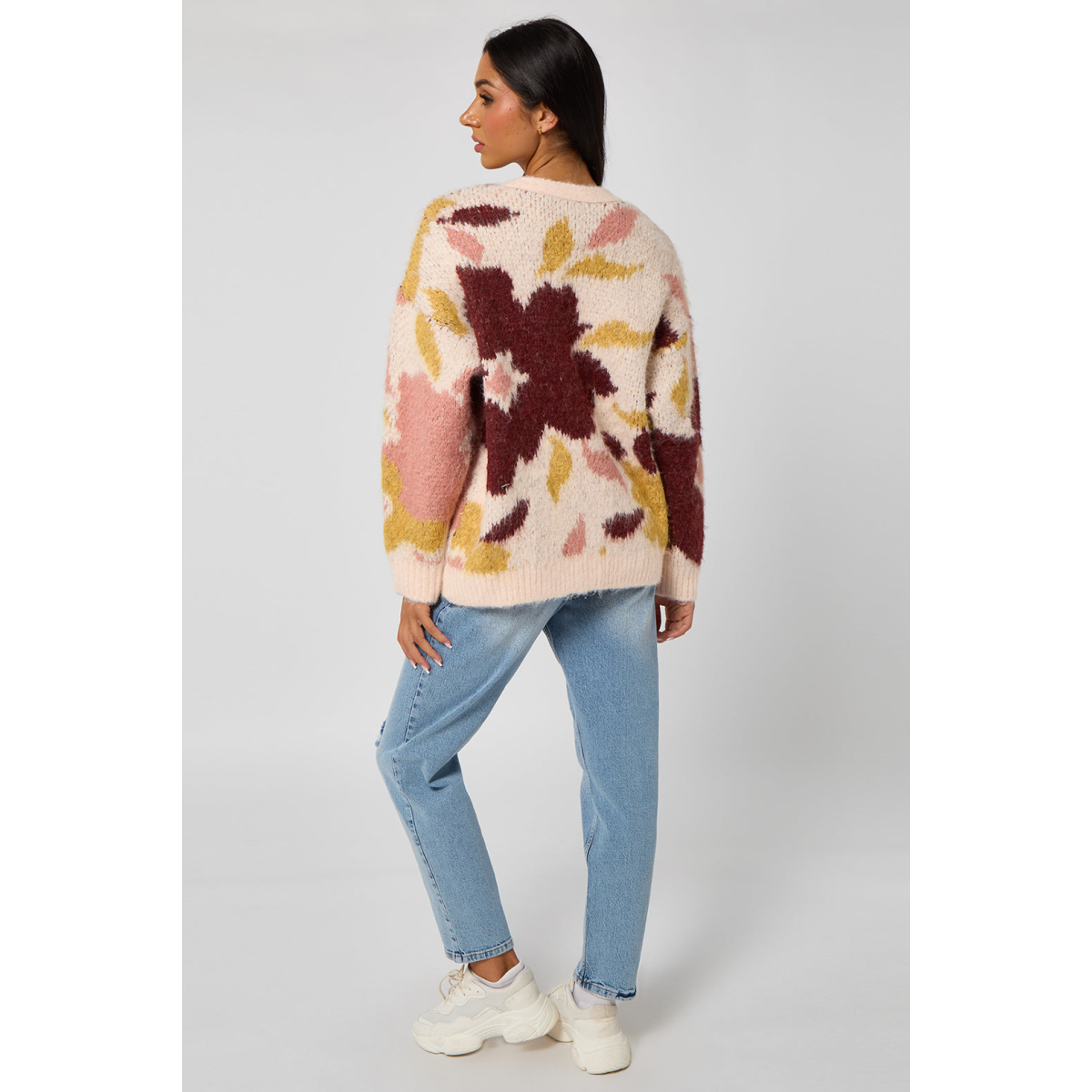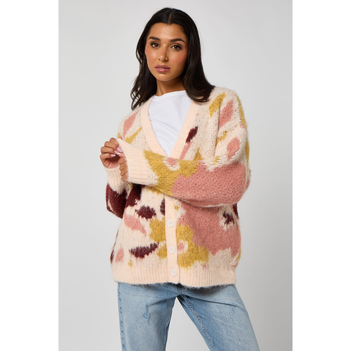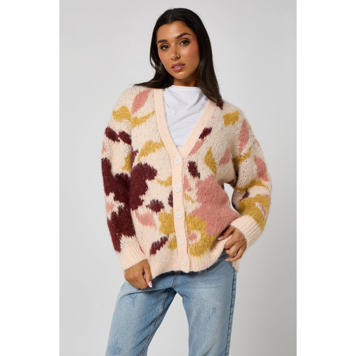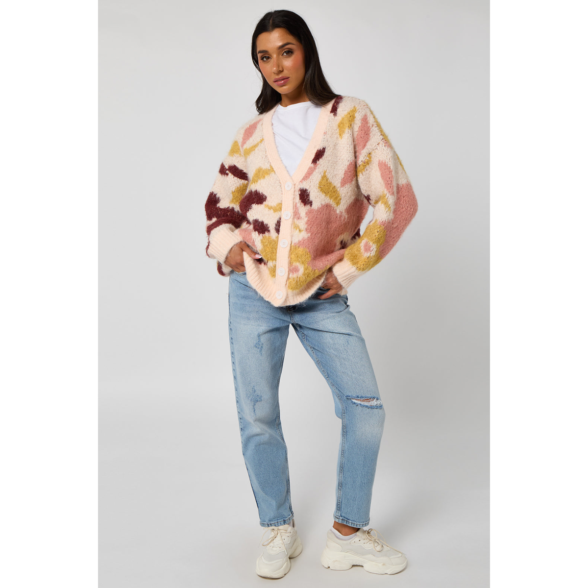 A bold, cosy cardigan with an oversized chunky knit and all-over floral design. Perfect for layering and adding a statement touch to casual looks.