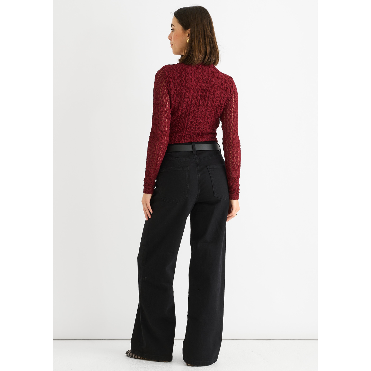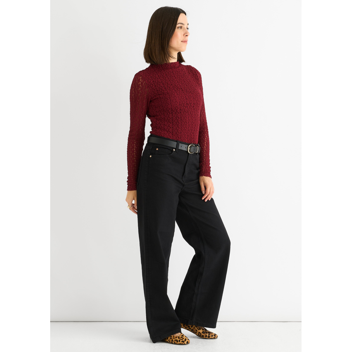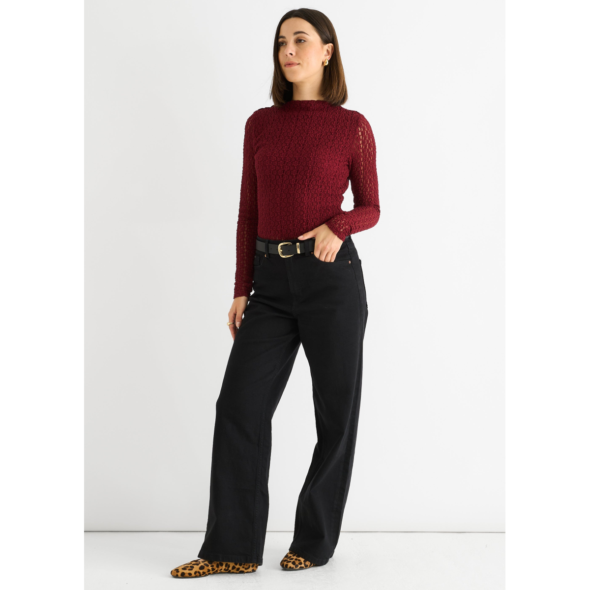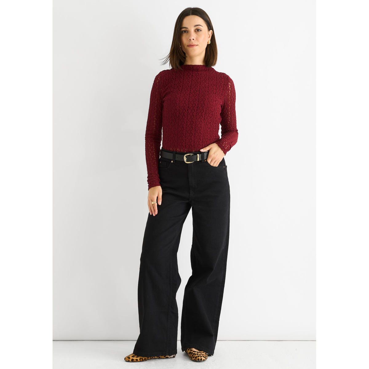 This burgundy top combines casual comfort with bold style. Crafted from soft jersey fabric, it features a high neck and long lace sleeves for a touch of elegance. Perfect for adding a confident, comfortable edge to your everyday wardrobe.
