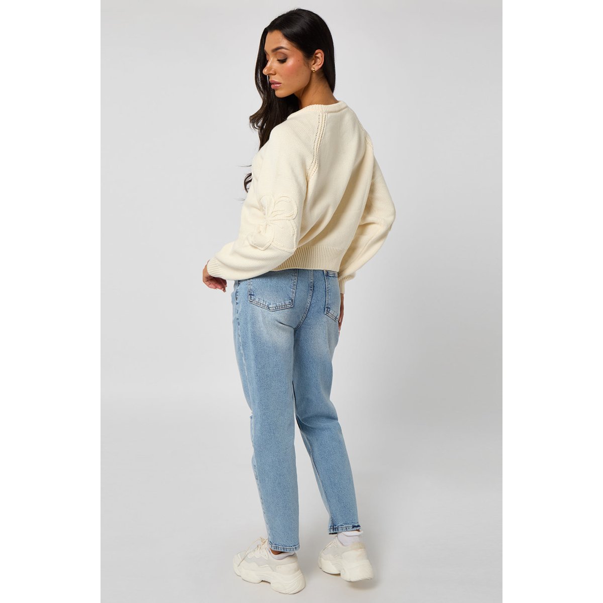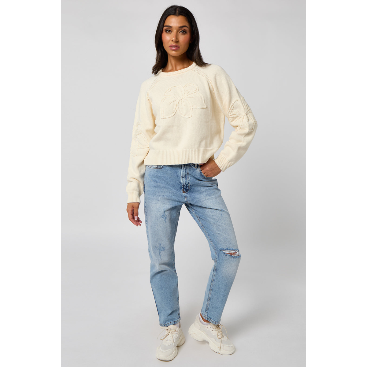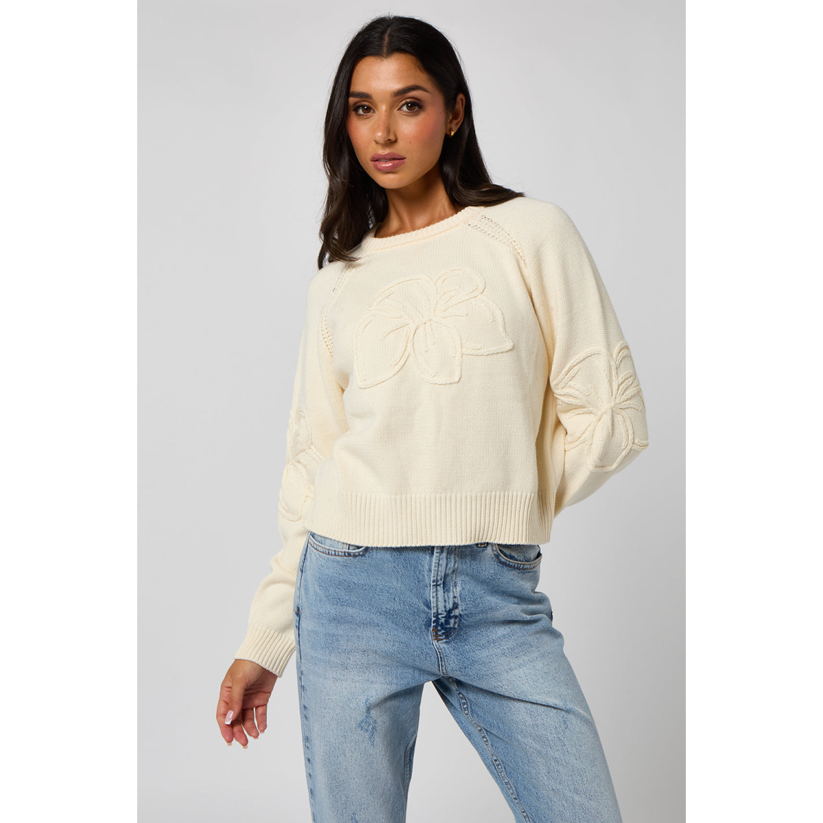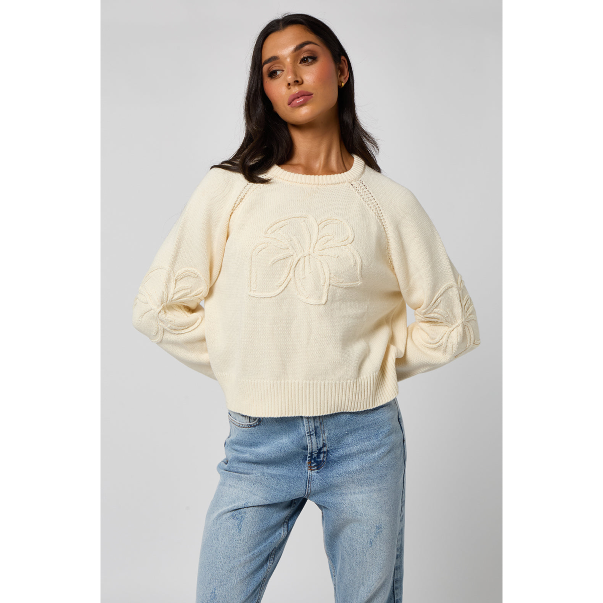 A relaxed-fit jumper featuring raglan sleeves with intricate crochet embroidery detail. A perfect blend of comfort and craftsmanship for effortless everyday style.