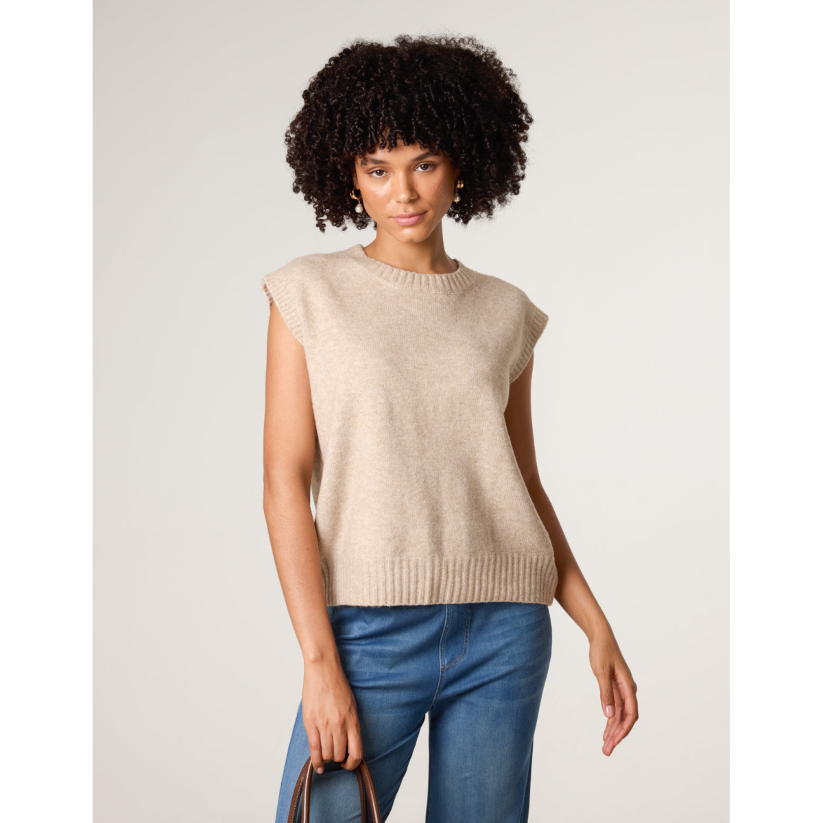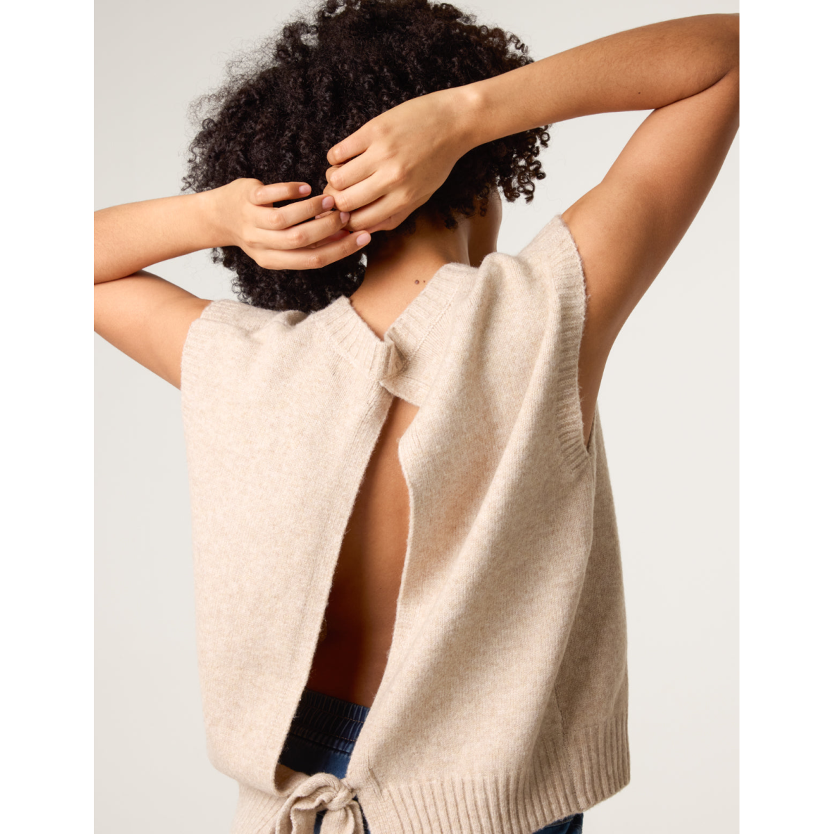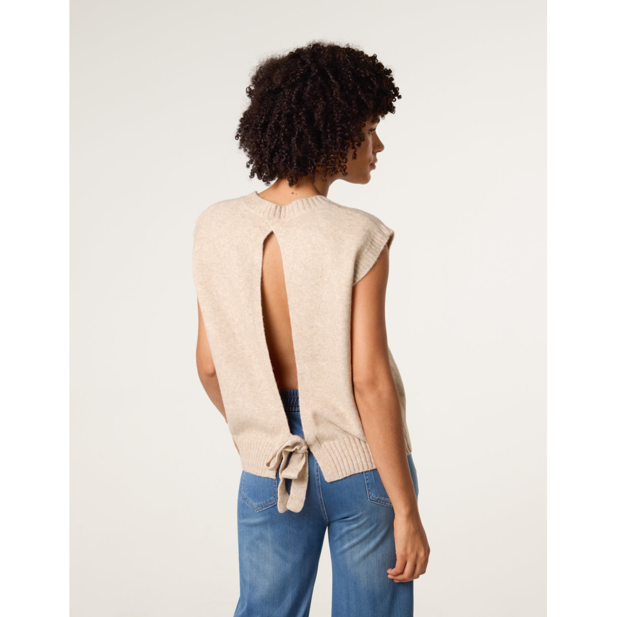 Warm up your wardrobe with this cute open back sleeveless jumper. The options are endless with this cosy knit. Team it layered over a shirt, or one it's own.