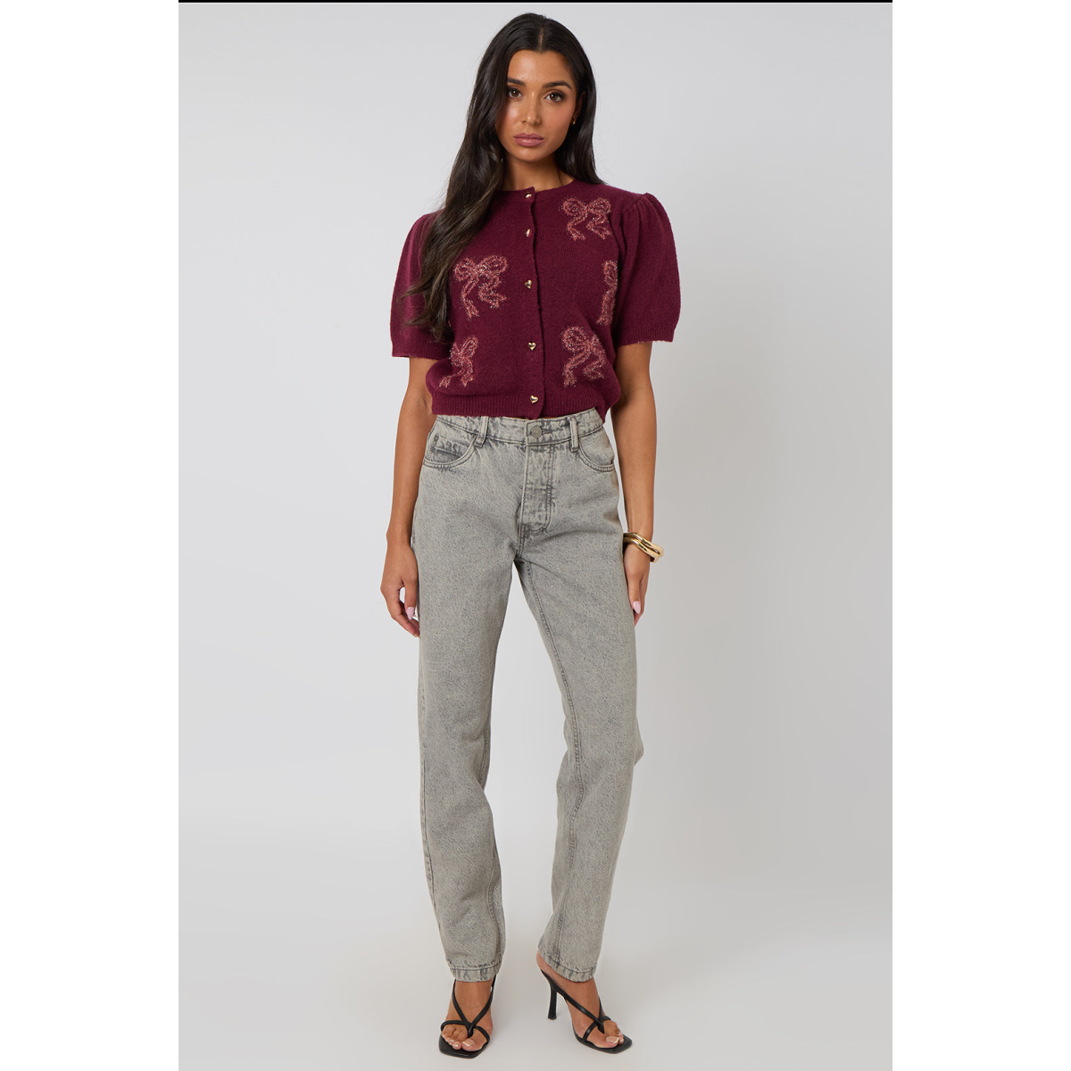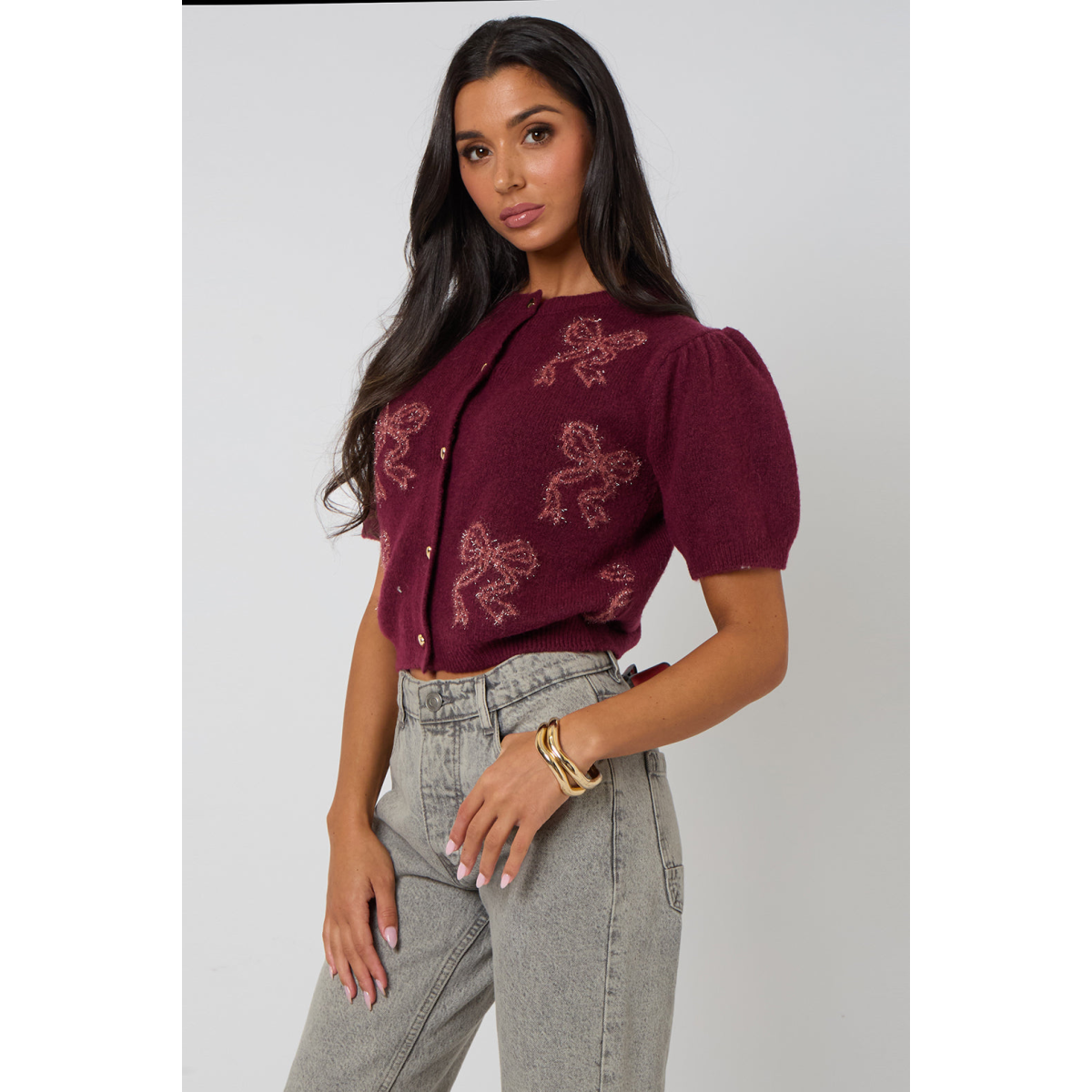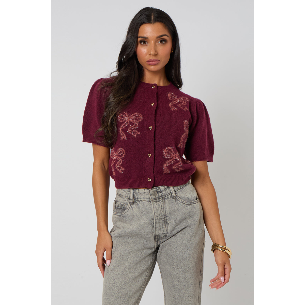 A feminine knit cardigan with short sleeves and delicate bow detailing. Lightweight and versatile, perfect for layering or wearing on its own.