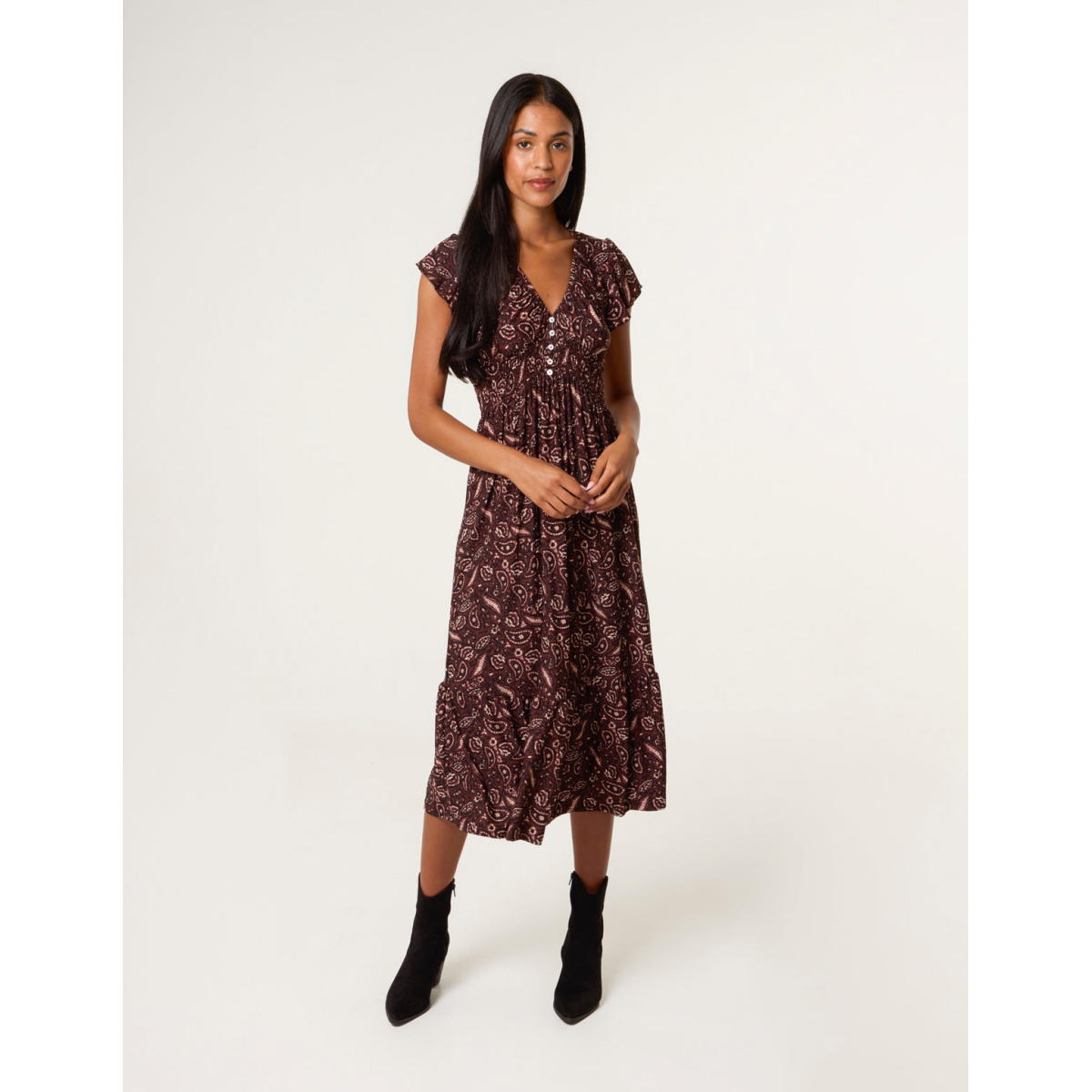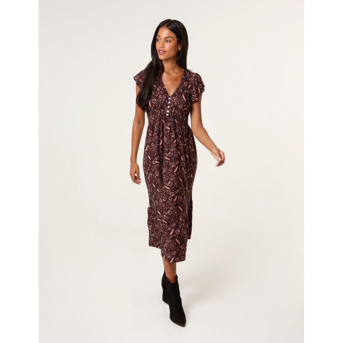 V Neck Midi Dress With Button Front