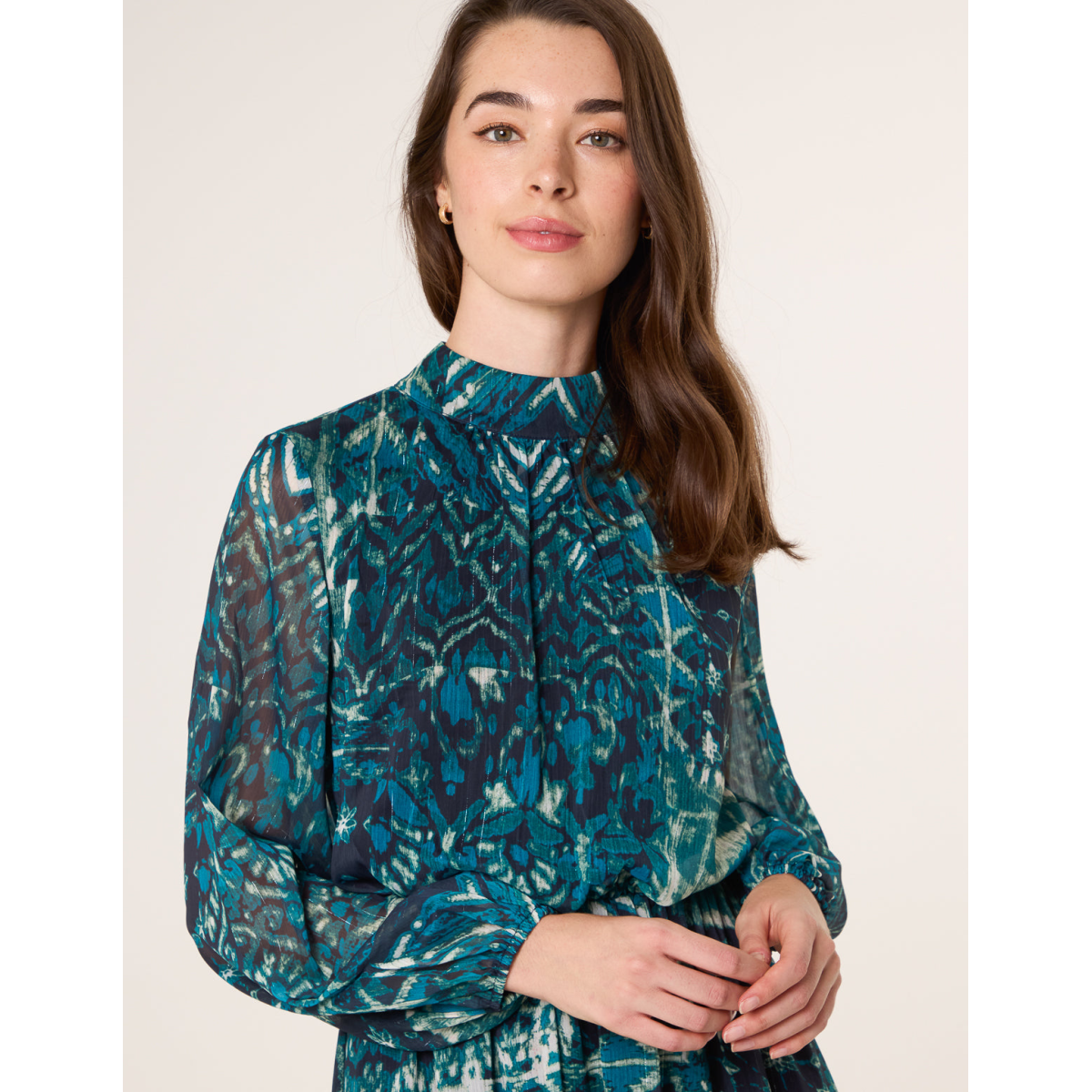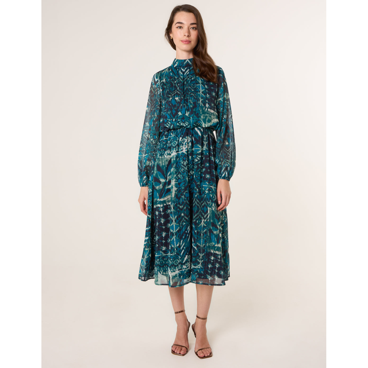 Teal tones for the new season. This stunning chiffon dress will add a pop of colour to your evening.