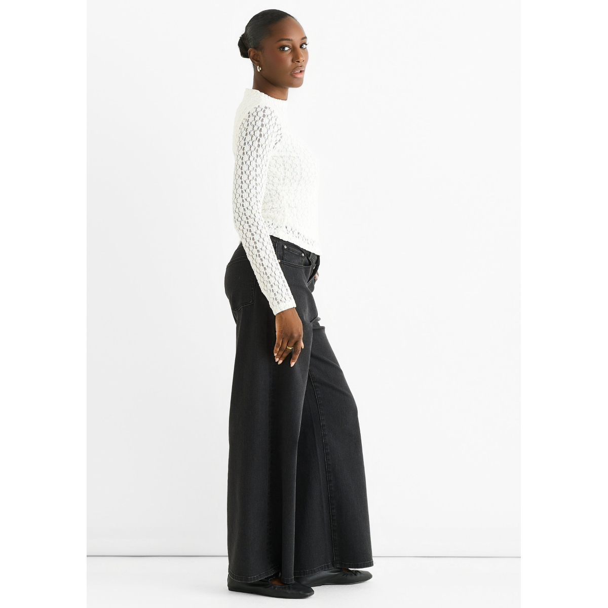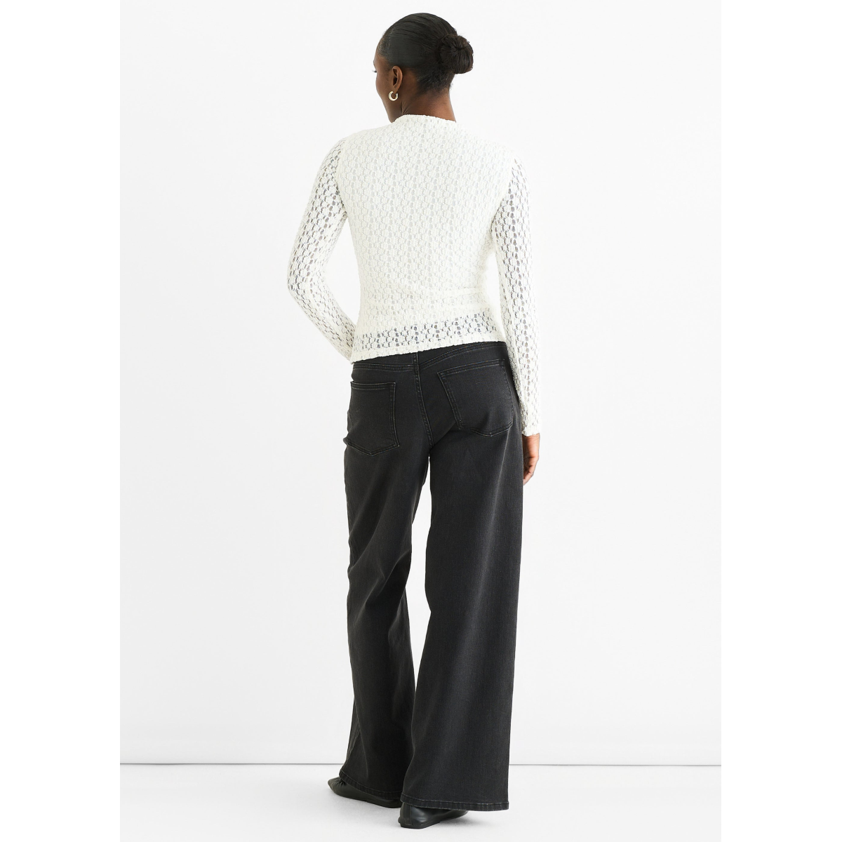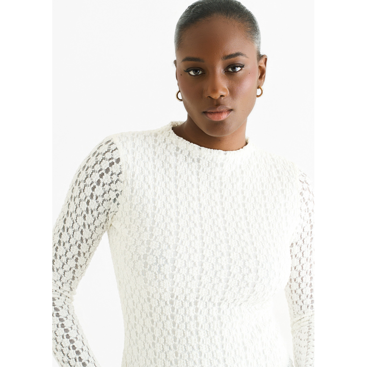 This white high-neck top blends comfort with bold style. Made from soft jersey fabric, it features long lace sleeves that add a delicate yet striking detail. Ideal for a casual look that stands out while keeping you comfortable all day.