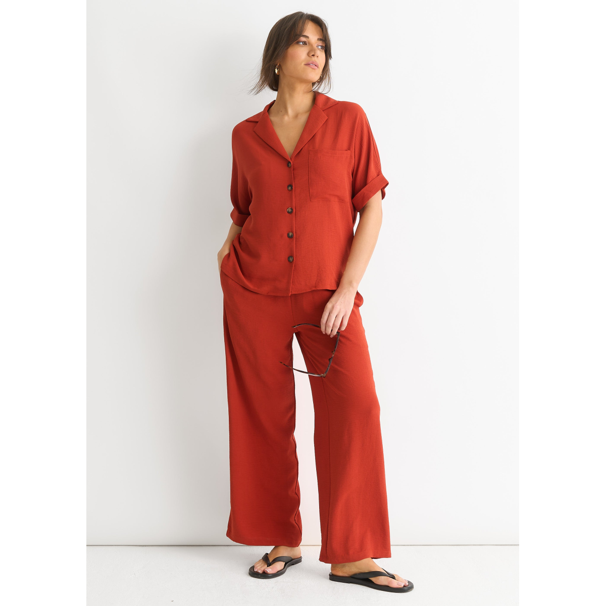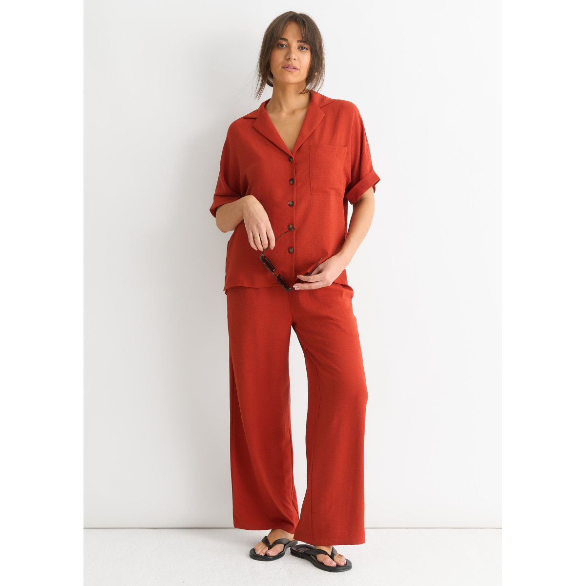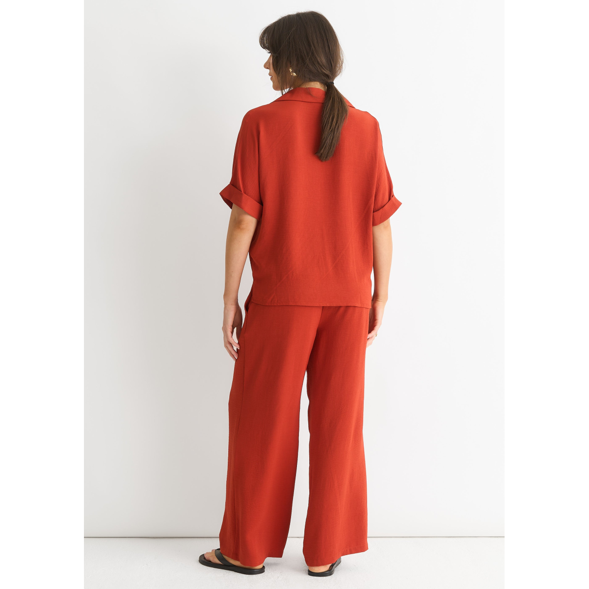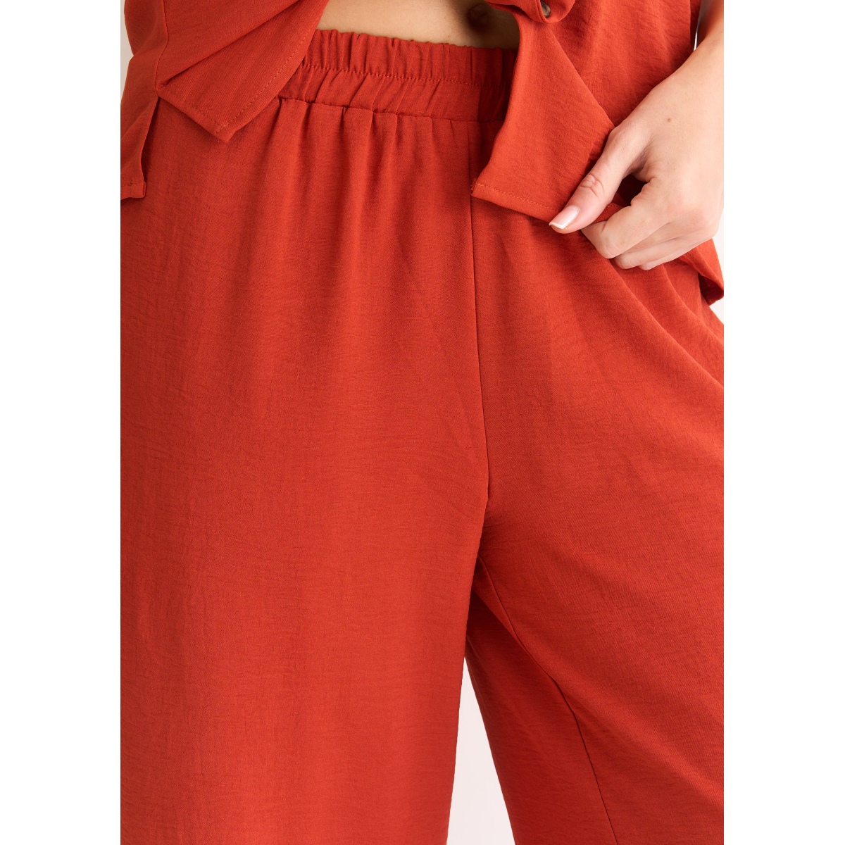 Effortlessly stylish, these rust wide leg trousers feature an elastic waist for a comfortable fit. Perfect for any occasion, they can be dressed up or down for a casual yet chic look. Say goodbye to uncomfortable pants and hello to fashionable comfort with these trousers.