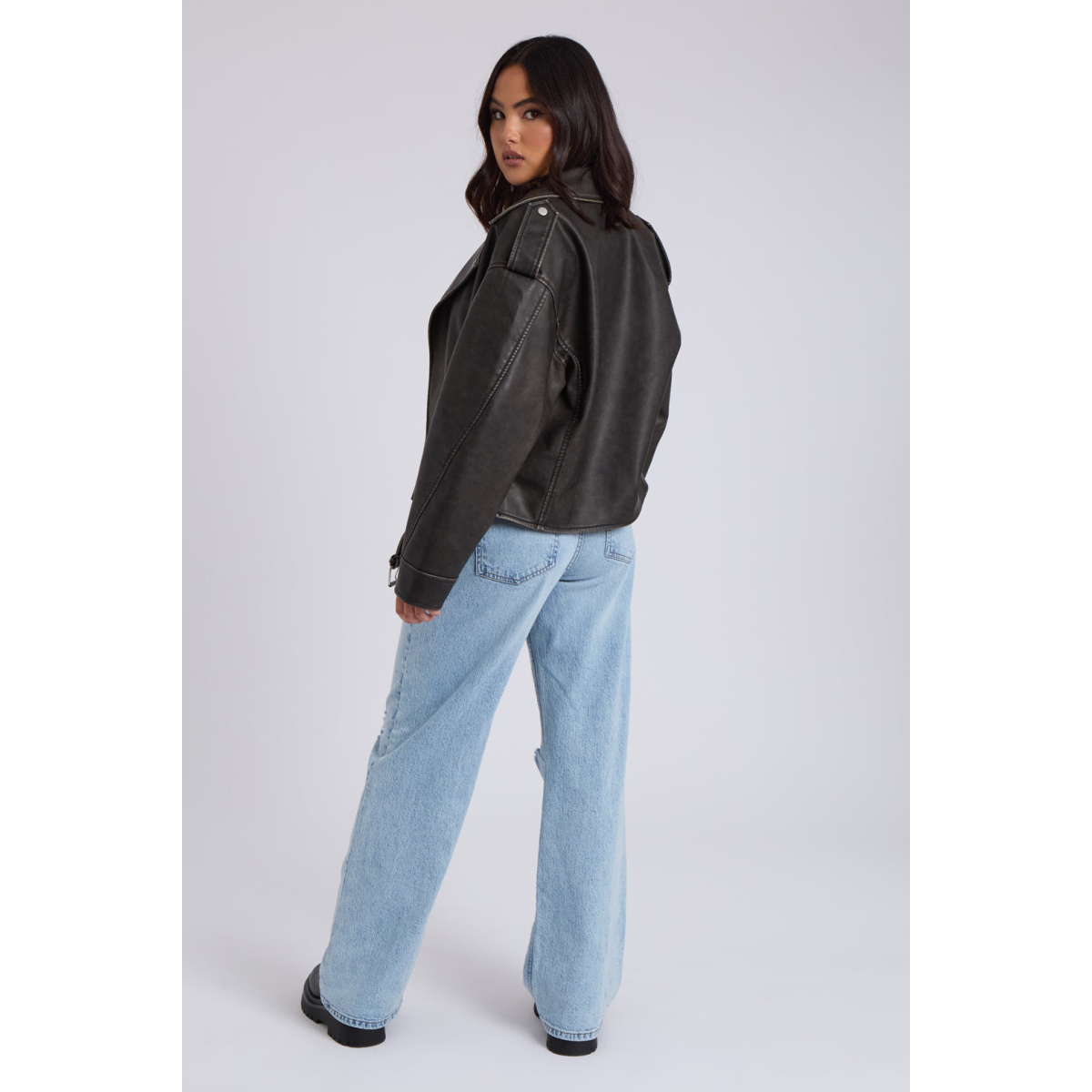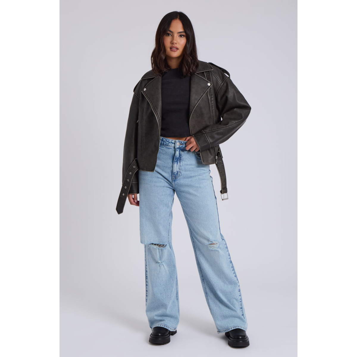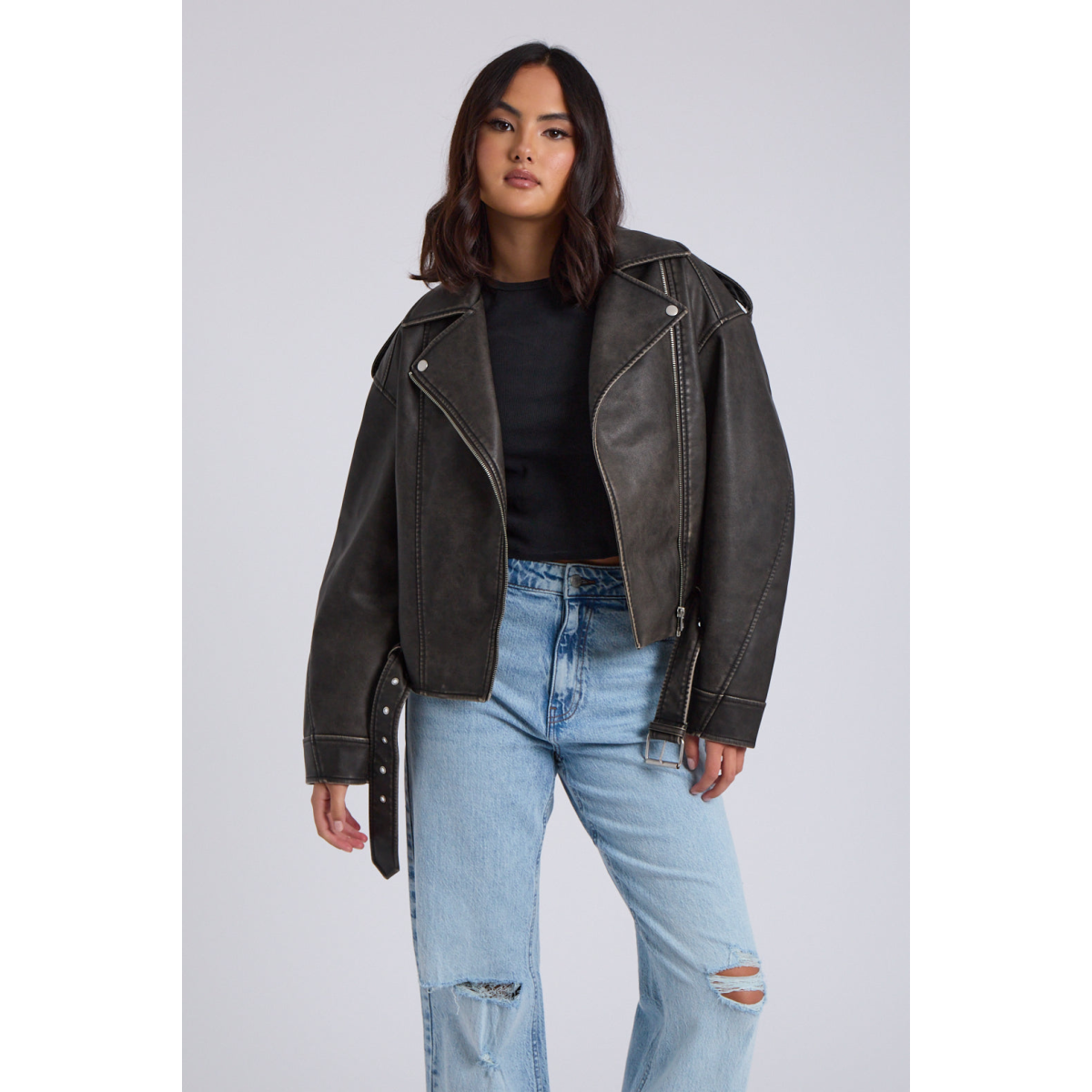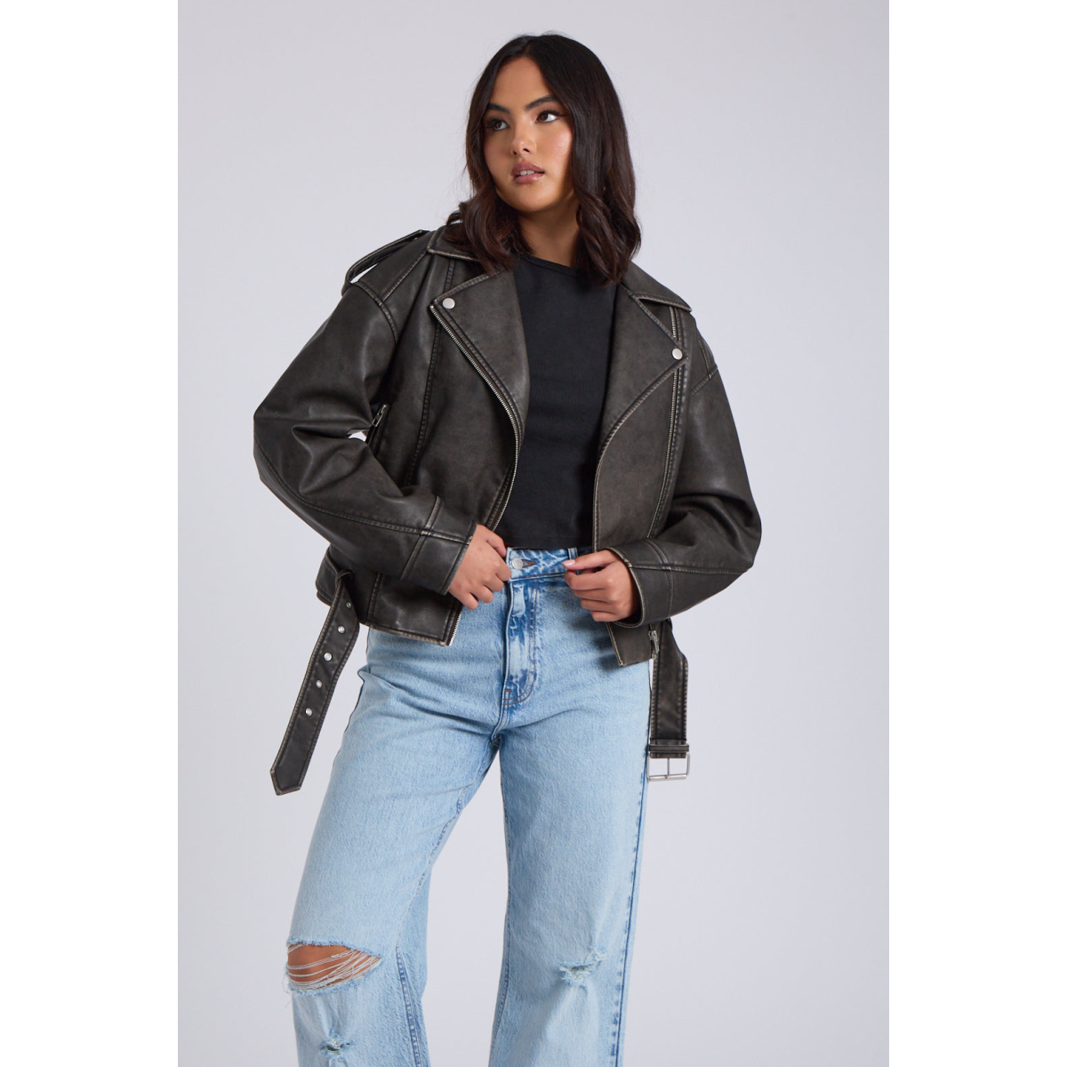 A distressed biker jacket combines rugged style with a worn-in, vintage appeal. This jacket typically features a classic cut with a slightly asymmetrical zipper closure, wide lapels, and epaulets on the shoulders. Made from high-quality leather or faux leather, the distressed biker jacket exudes a sense of rebelliousness and adventure, making it a timeless staple in any edgy, fashion-forward wardrobe.