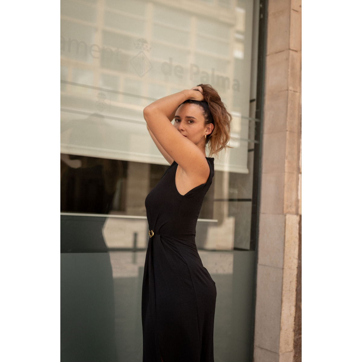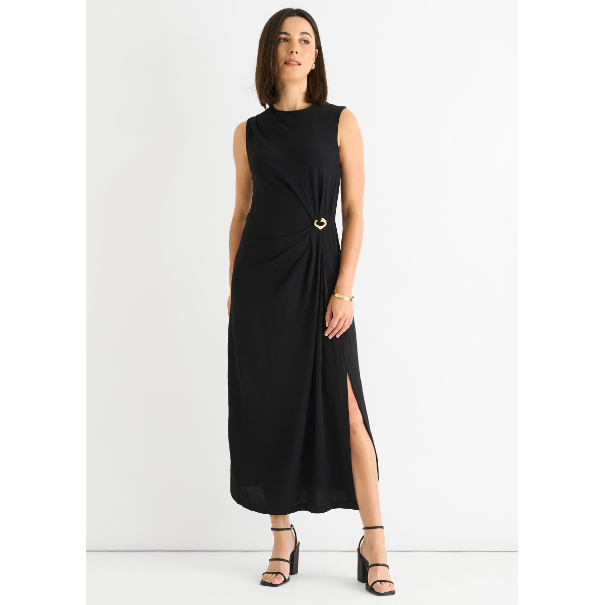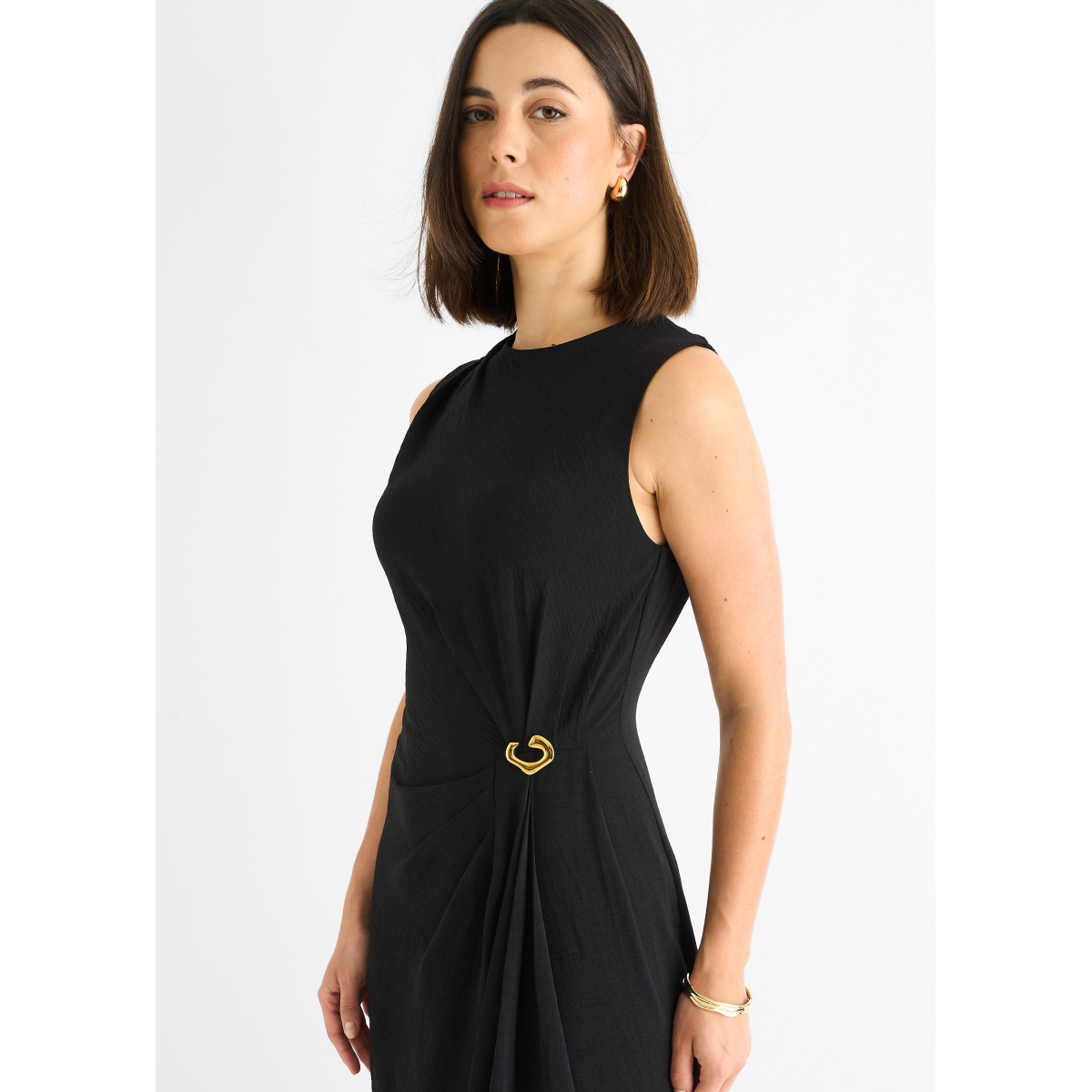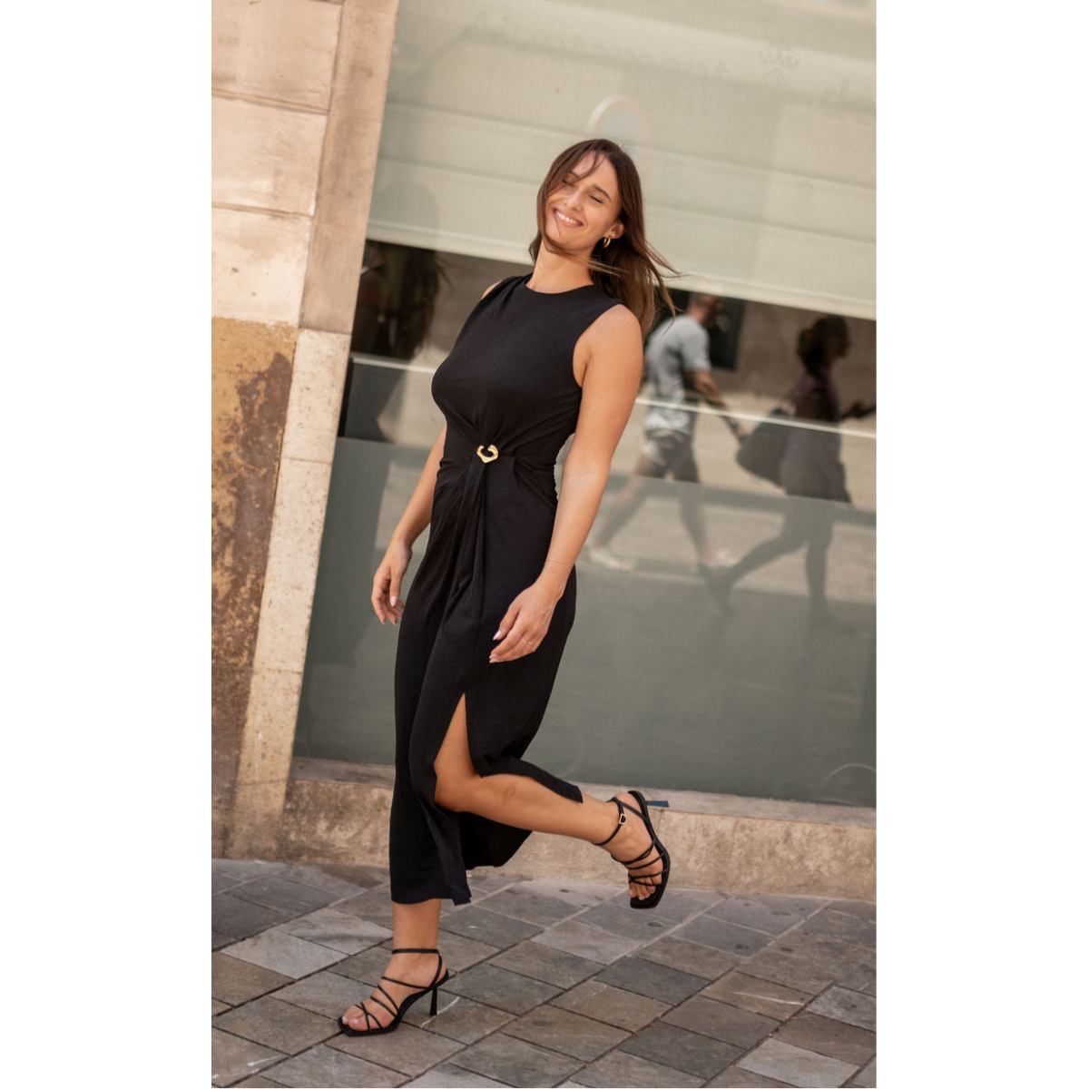 This sleeveless midi dress features a flattering ruched waist with a sleek metal trim, combining comfort with a bold, stylish edge. Its black fabric offers versatile wear for casual outings or confident evening looks, ensuring you feel both relaxed and striking wherever you go.