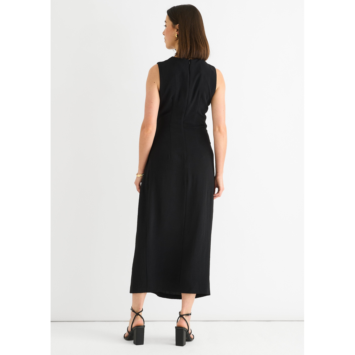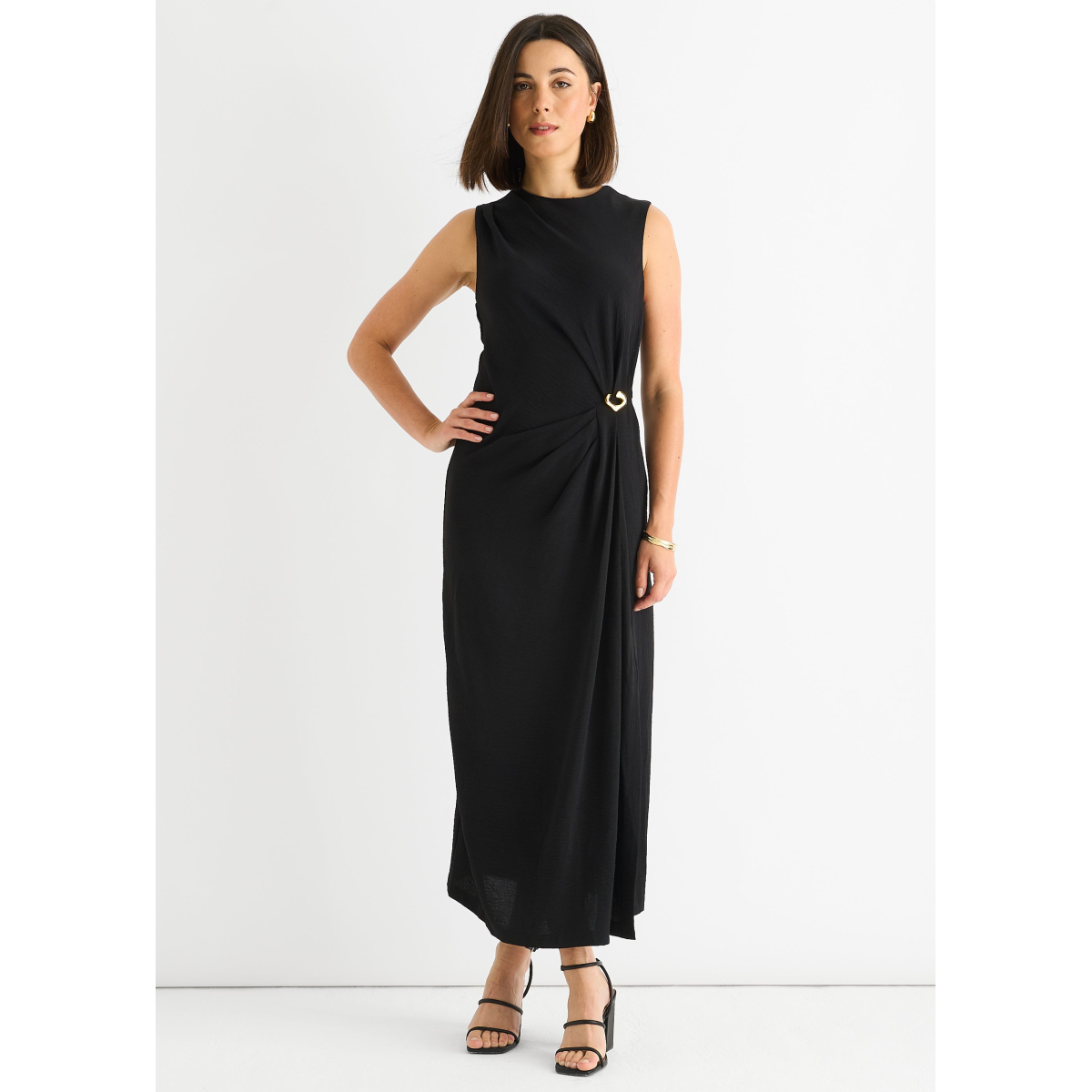 Black Waist Ruched Metal Trim Sleeveless Midi Dress