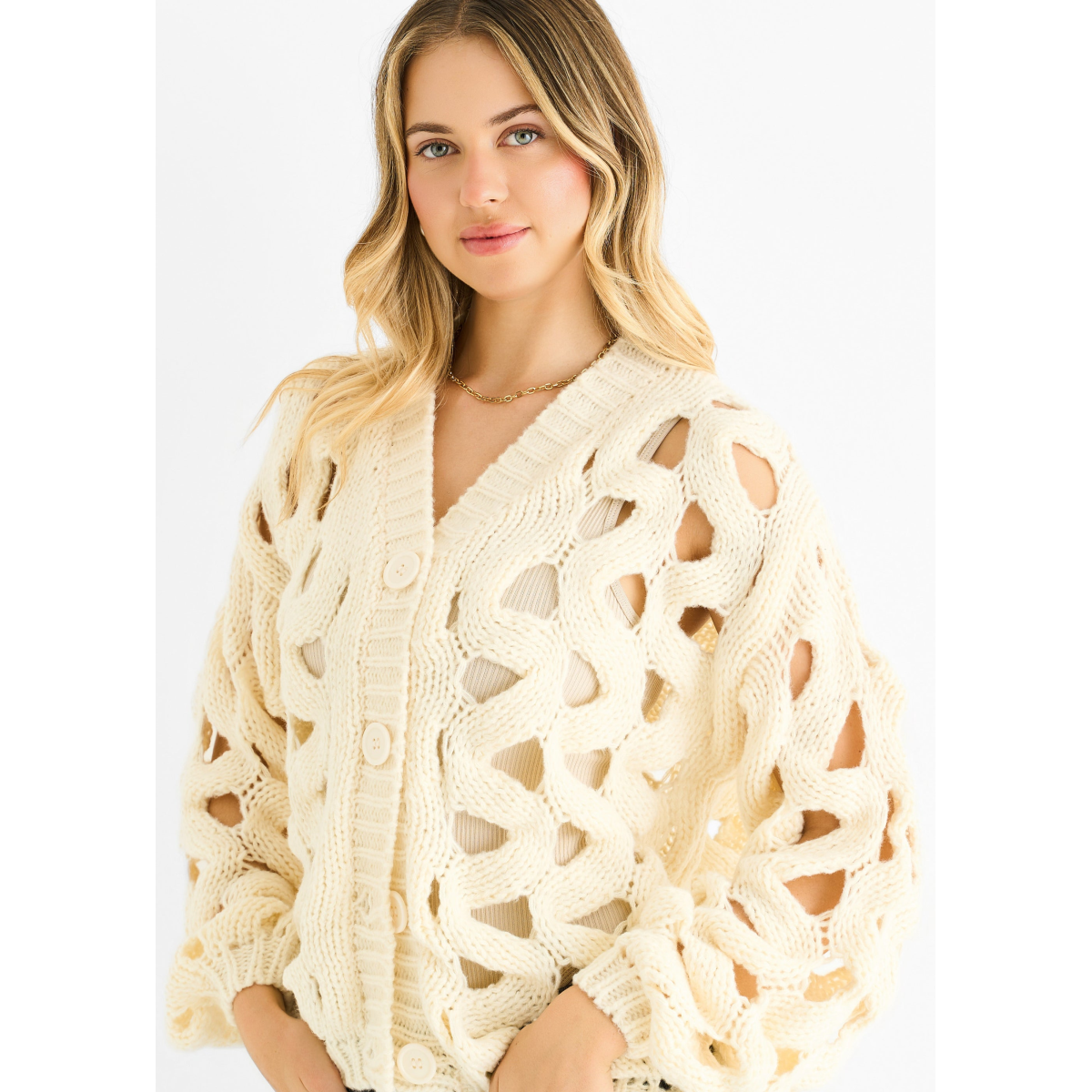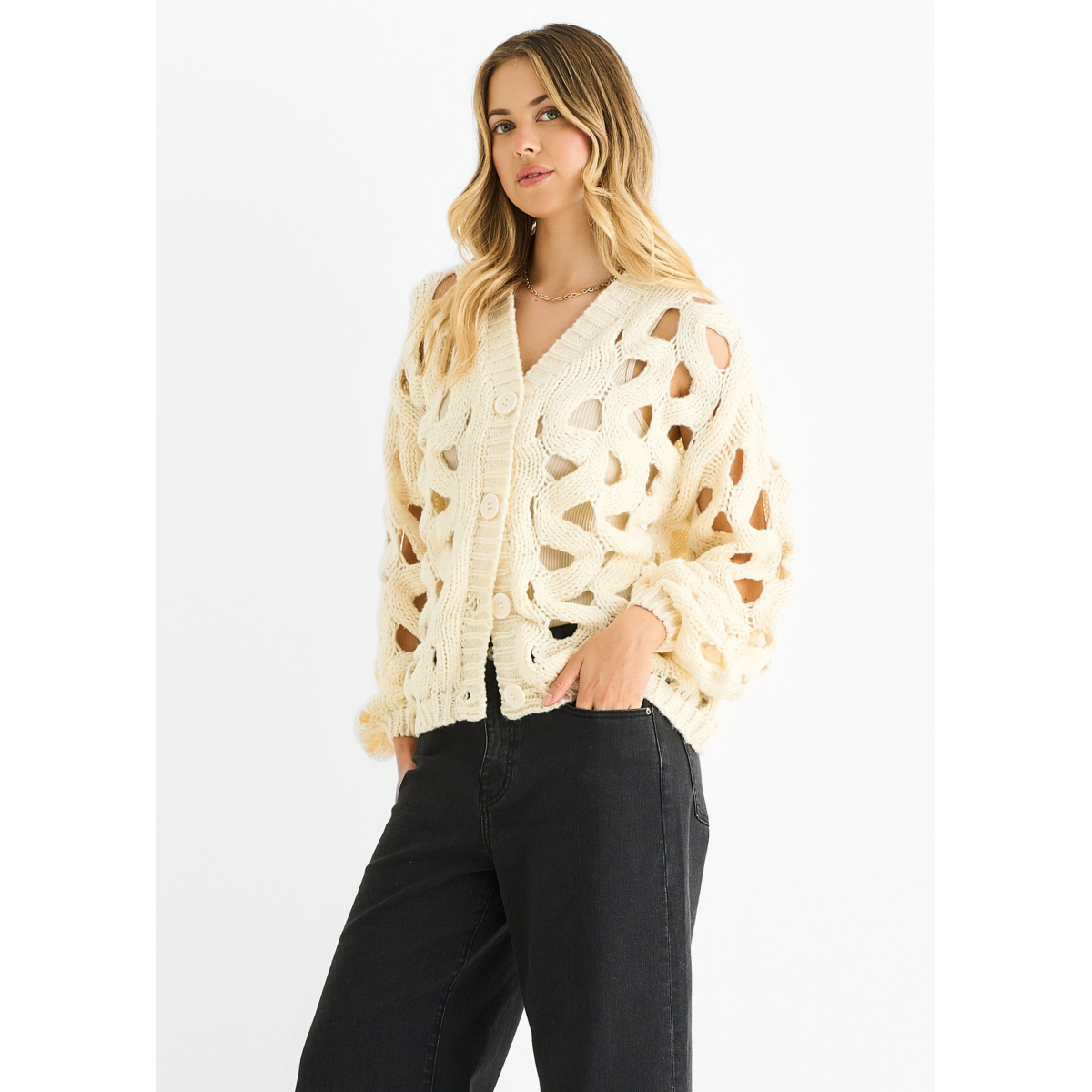 Stay cozy and stylish with the Cream Hollow Chunky Knit Cardigan. Its thick knit design offers warmth and comfort, perfect for layering on chilly days. The bold texture adds a casual yet eye-catching touch to any outfit, making it an essential piece for relaxed, confident looks.