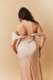 Light Gold Satin Bardot Ruched Maxi Dress