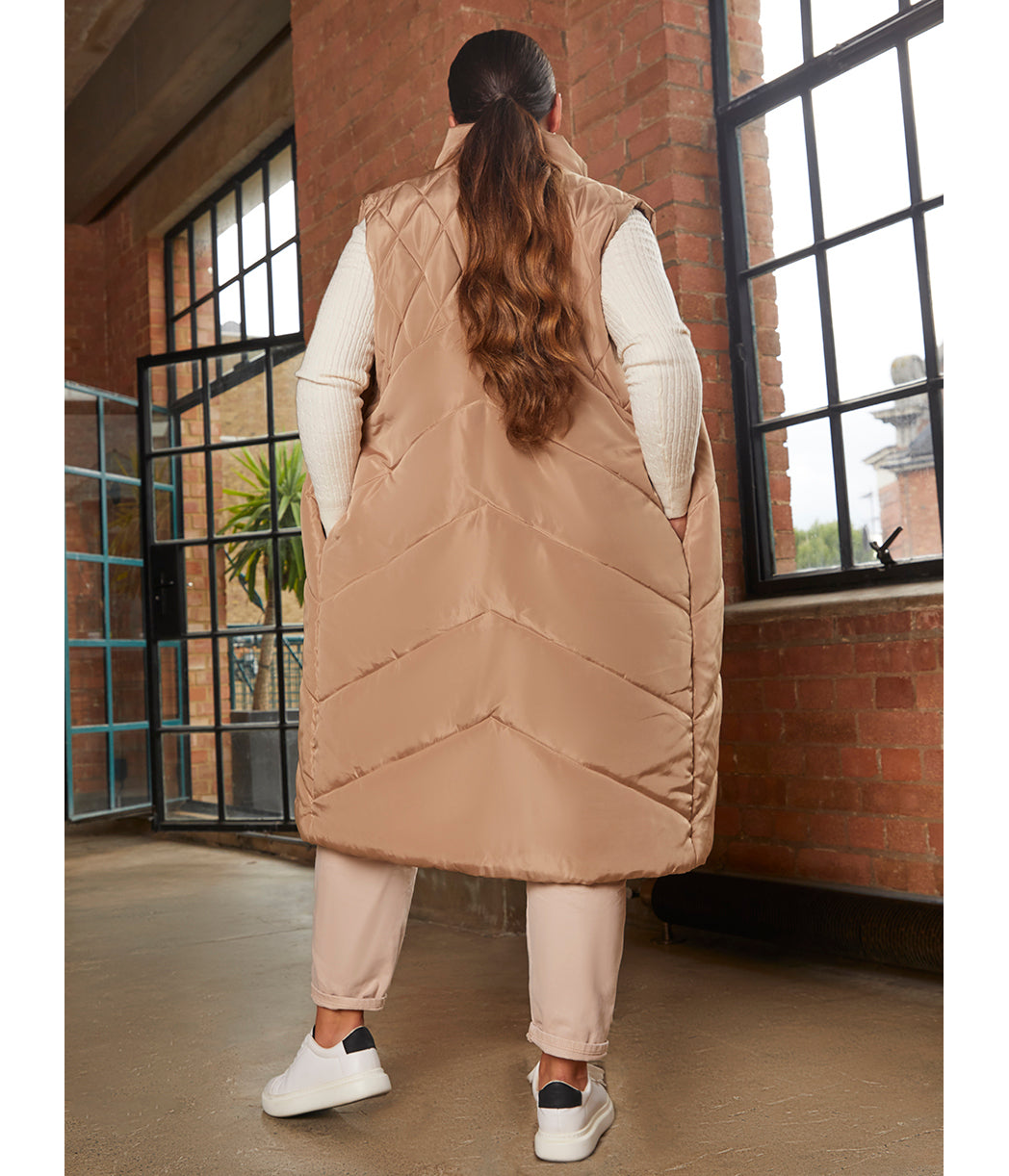 CHI CHI LONDON Chi Chi London Diamond Quilt Detail Longline Padded Gilet in Tan