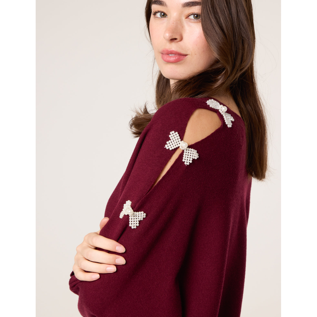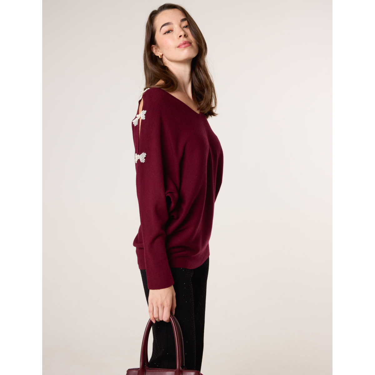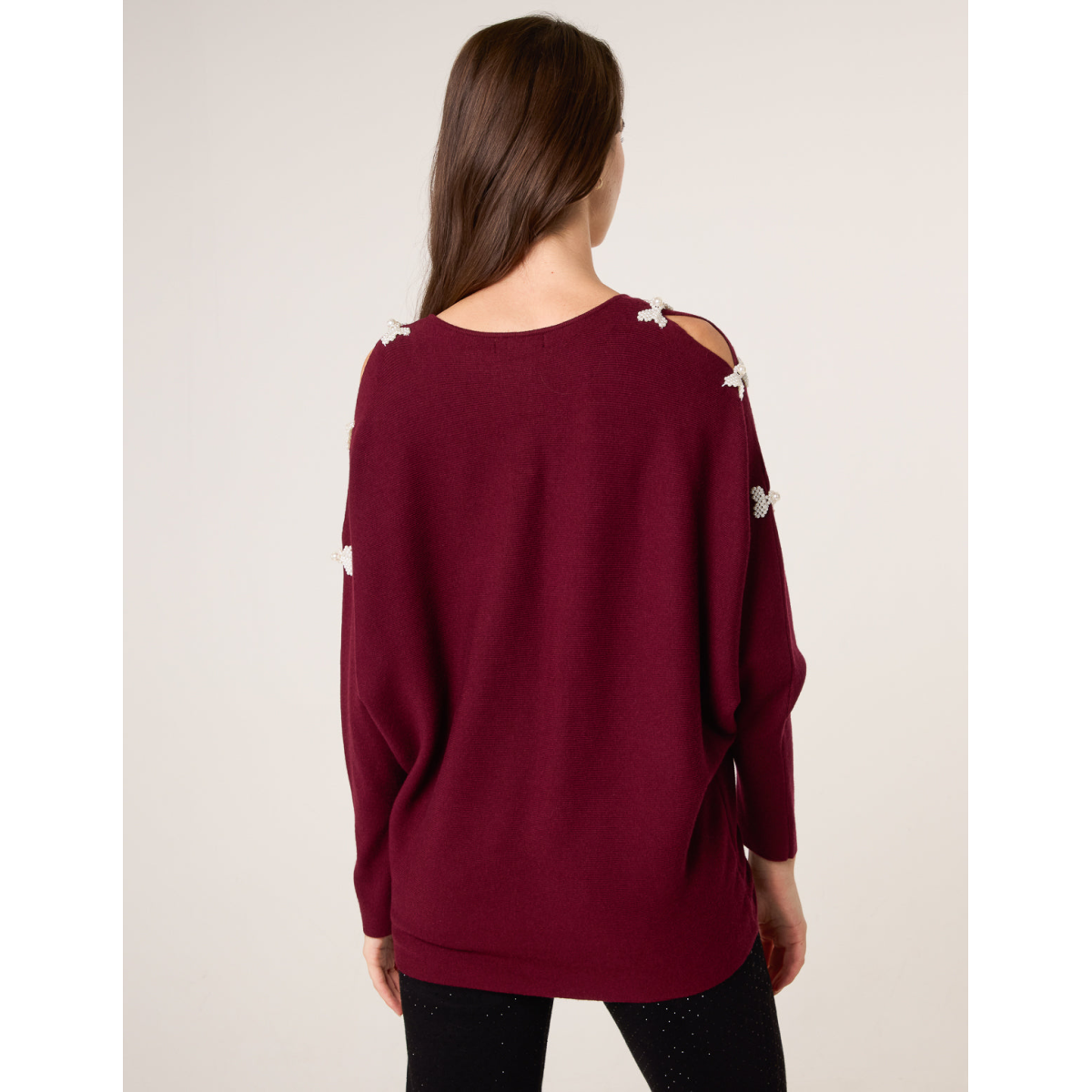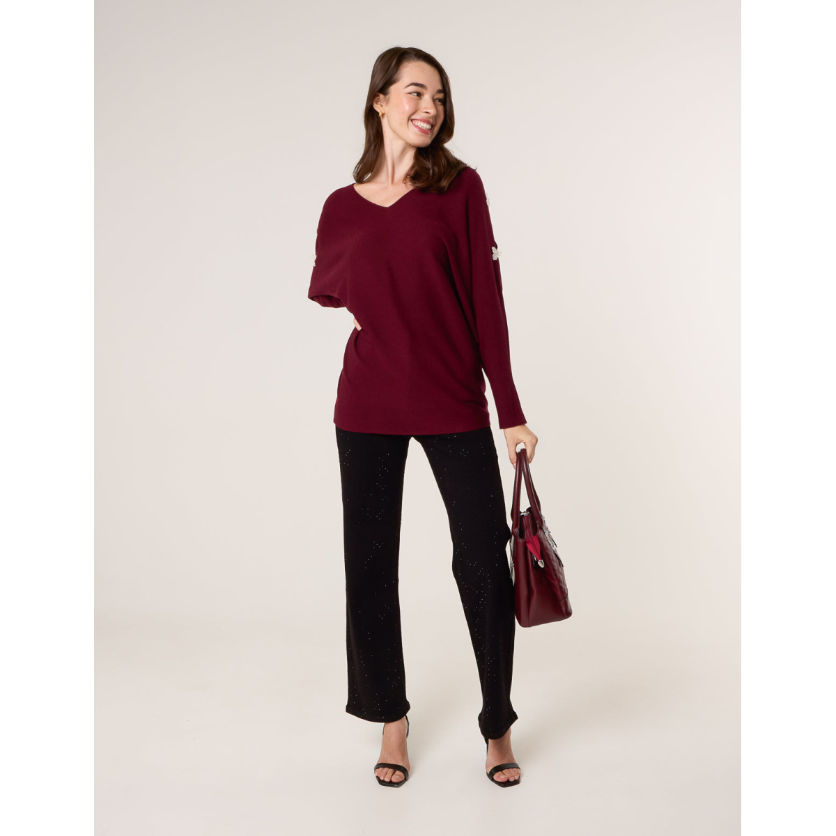 V-Neck Batwing Shoulder Pearl Detailing Jumper